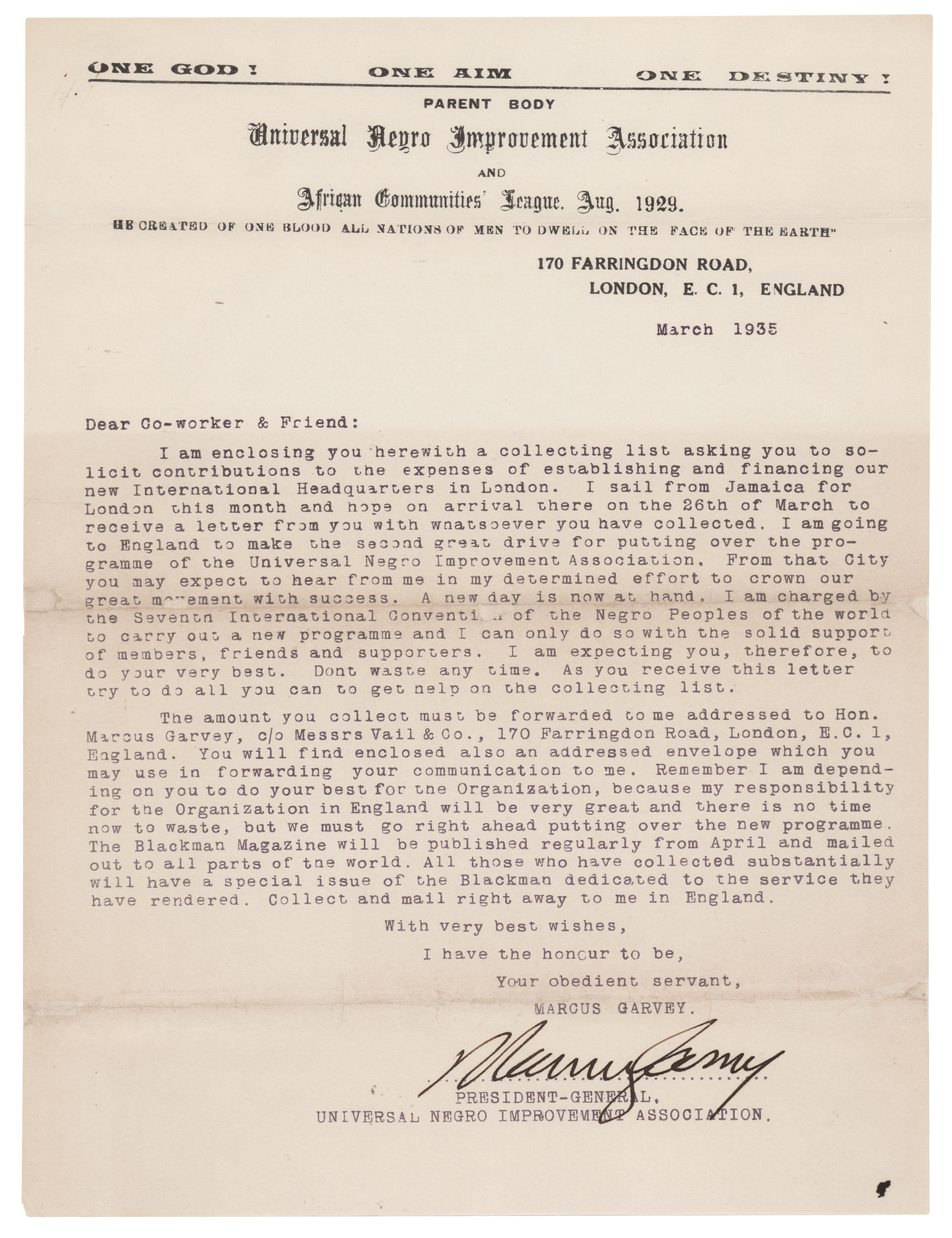 Political leader and publisher (1887-1940) who was a staunch proponent of the black nationalism and Pan-Africanism movements. TLS, one page, 8.25 x 11, Universal Negro Improvement Association letterhead, March 1935. Form letter to a "Co-worker & Friend," in part: "I am…asking you to solicit contributions to the expenses of establishing and financing our new International Headquarters in London. I sail from Jamaica for London this month…I am going to England to make the second great drive for putting over the programme of the Universal Negro Improvement Association. From that city you may expect to hear from me in my determined effort to crown our great movement with success." In very good to fine condition, with repaired partial separations to horizontal folds. A boldly signed letter by this controversial early civil rights leader.