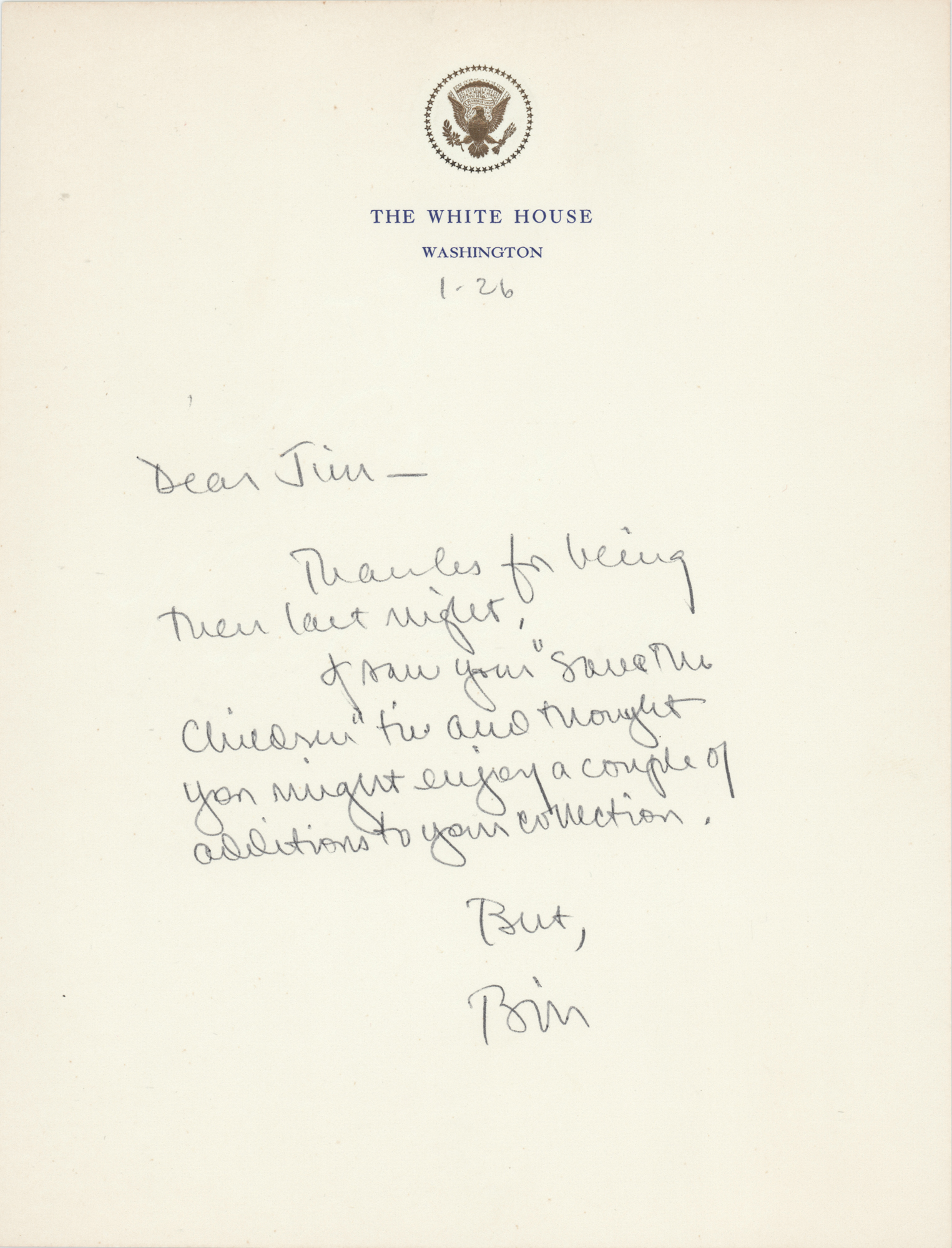 ALS signed “Bill,” likely as president, one page, 6.75 x 8.75, White House letterhead, January 26 (no year). Handwritten letter to “Jim,” in full: “Thanks for being there last night. I saw your ‘Save the Children’ tie and thought you might enjoy a couple of additions to your collection.” In very fine condition.