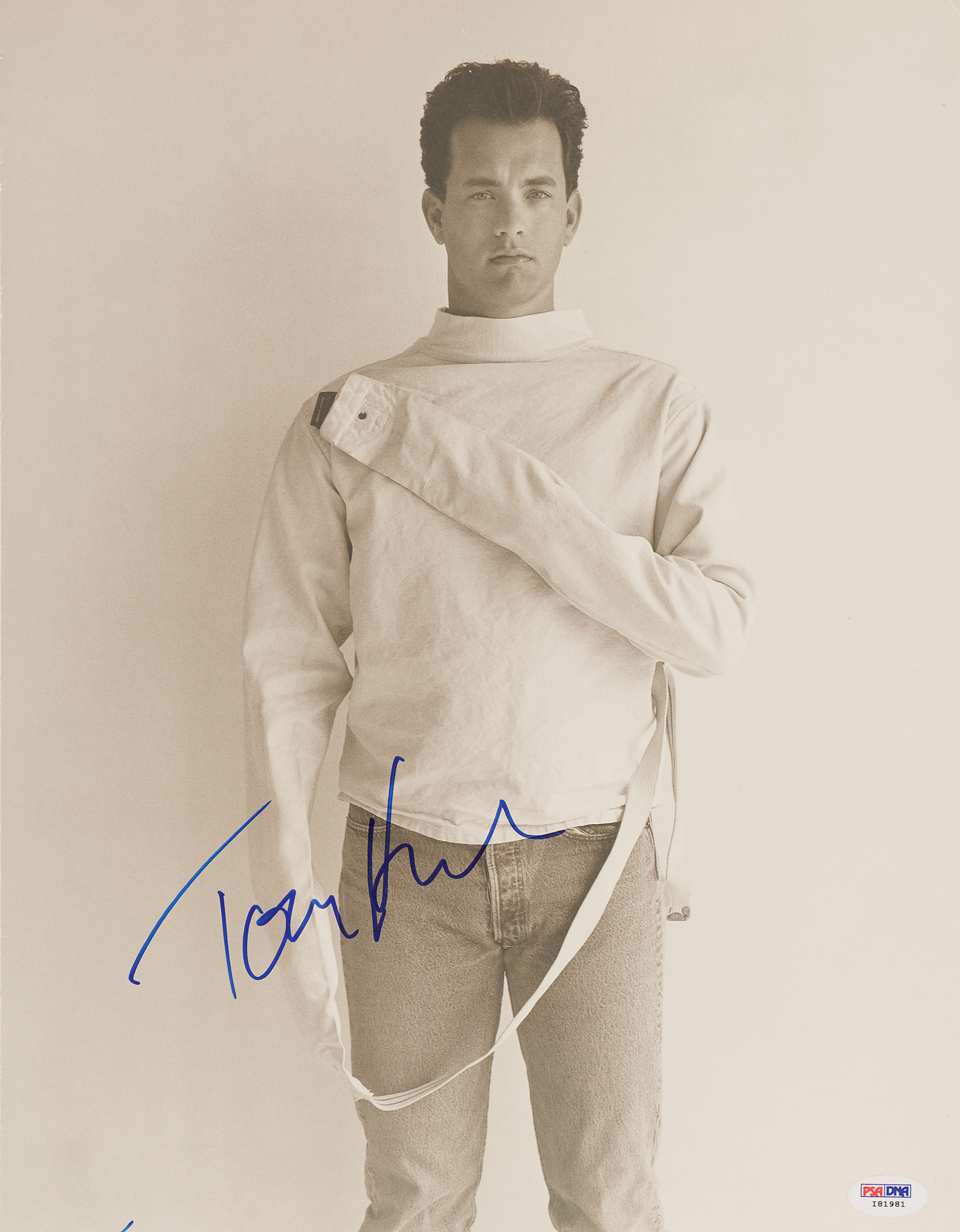 Large 11.75 x 15 book photo of actor Tom Hanks in a straitjacket, a page removed from the 1988 book Herb Ritts: Pictures, signed prominently in blue felt tip by Hanks. In very fine condition, with a PSA/DNA label affixed to the lower right corner. Accompanied by a certificate of authenticity from PSA/DNA.