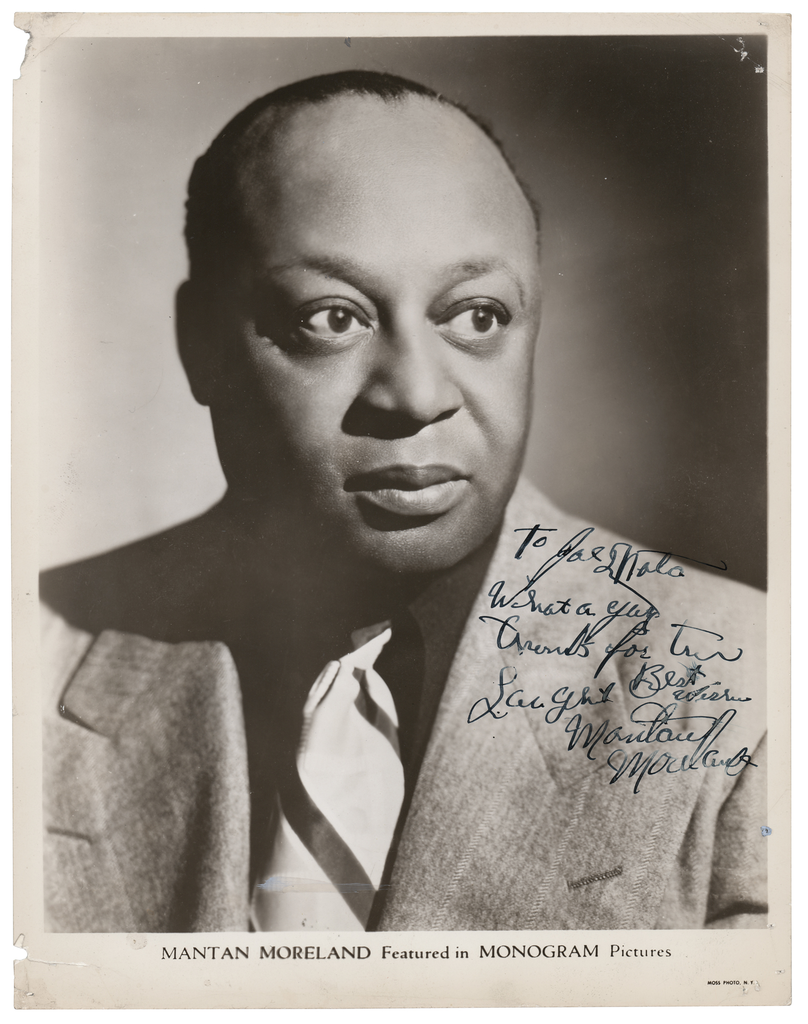 Talented and prolific character actor (1902-1973) with great comic timing who appeared in hundreds of films, best remembered as Birmingham Brown, Charlie Chan's chauffeur in a number of films. Vintage glossy 8 x 10.25 Monogram Pictures publicity photo of Moreland, signed and inscribed in fountain pen, "To Joe…What a guy – Thanks for the laughter, Best wishes, Mantan Moreland.” In very good to fine condition, with scattered light creasing, and tack holes and associate loss to the corners.