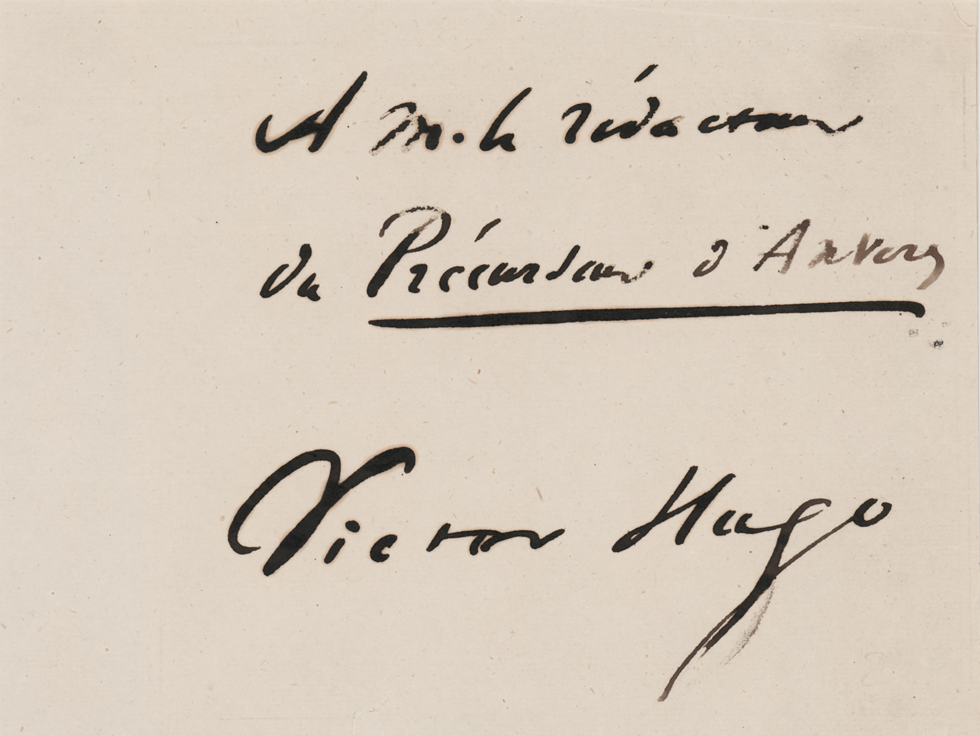 Bold ink signature and inscription, "A M. le redacteur du Precurseur d'Anvers, Victor Hugo,” with an upper inscription in French, penned on an off-white 6 x 4.5 sheet. In fine condition.