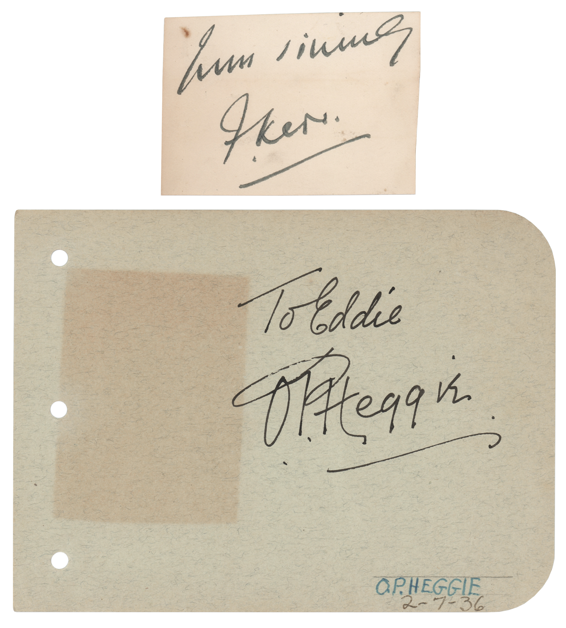Two rare fountain pen signatures of noted Frankenstein actors O. P. Heggie and Frederick Kerr: “To Eddie, O. P. Heggie,” on an off-white 6 x 4.5 album page, and "Yours sincerely, F. Kerr," on an off-white 2.75 x 2 clipped slip. In overall very good to fine condition, with a small block of toning to the Heggie page.