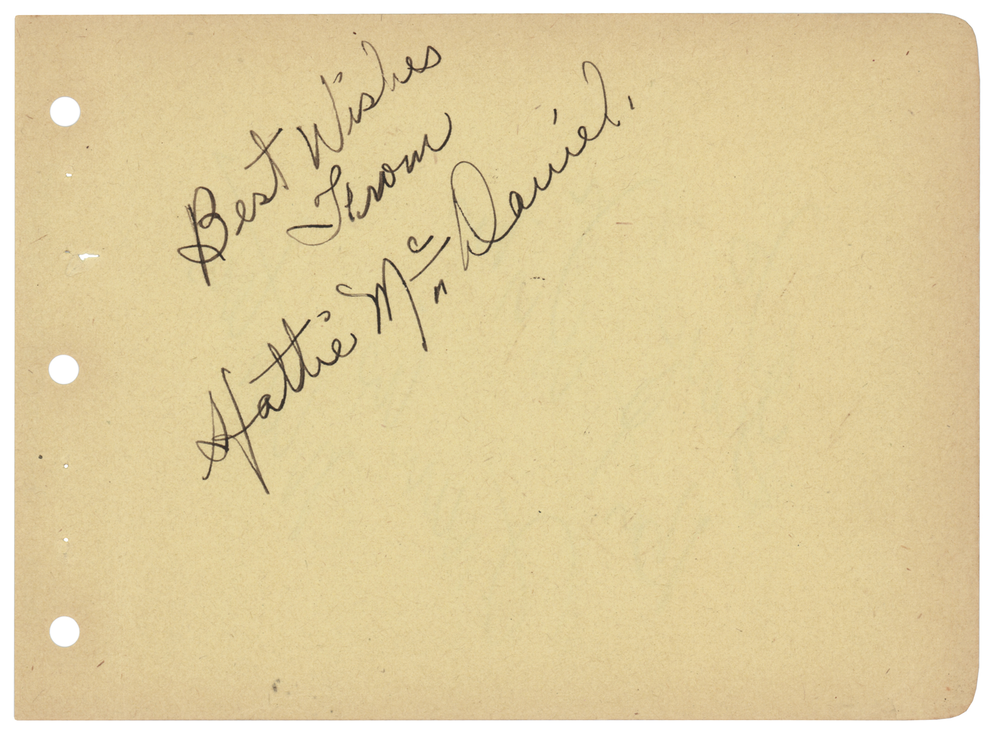 Vintage ink signature, "Best wishes from Hattie McDaniel,” on a yellow 6 x 4.5 album page. In very fine condition.