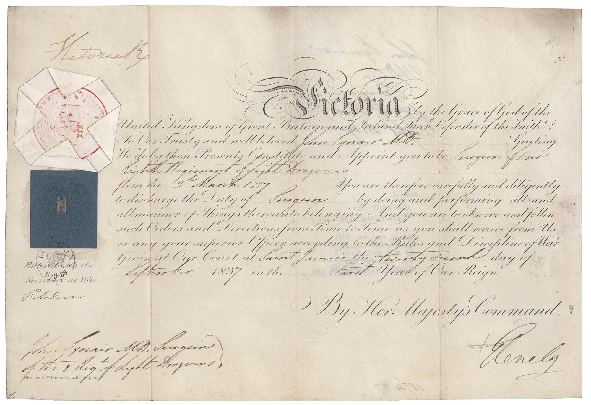 Partly-printed vellum DS, signed “Victoria R.,” one page, 13.5 x 9.25, September 22, 1837. The queen appoints John Synnir, M.D., to be “Surgeon of Our Eighth Regiment of Light Dragoons.” Signed in the upper left corner by Queen Victoria. The embossed paper seal and blue revenue stamp remain intact. In fine condition. An exceptionally early signed document from the queen, who began her incredible 63-year reign just three months prior.