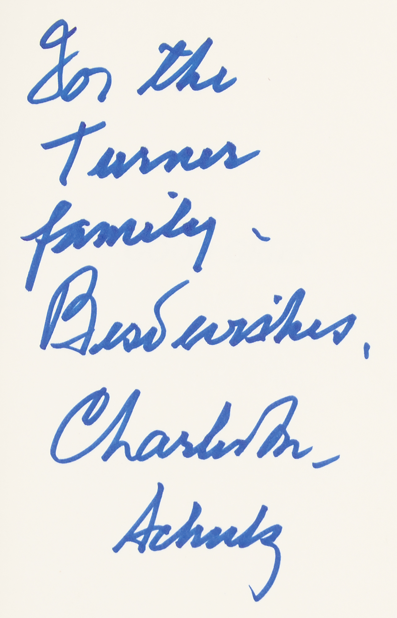 Signed book: Good Grief: The Story of Charles M. Schulz by Rheta Grimsley Johnson. First edition. NY: Pharos Books, 1989. Hardcover with dust jacket, 6.25 x 9.25, 256 pages. Signed and inscribed on the first free end page in blue felt tip, "For the Turner family - Best wishes, Charles M. Schulz." In fine condition.