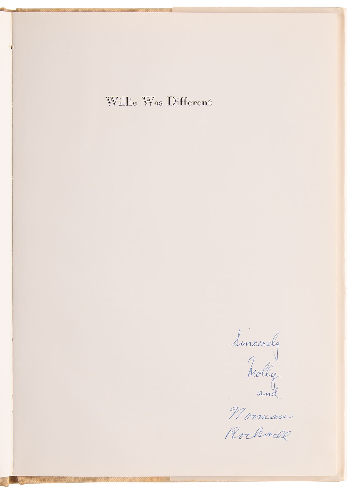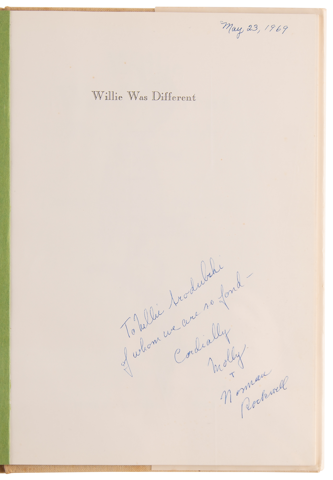 Twice-signed book: Willie Was Different: The Tale of an Ugly Thrushling. Later printing. NY: Funk & Wagnalls, 1969. Hardcover with dustjacket, 7.25 x 10.25, 42 pages. Signed and inscribed on the half-title page in blue ballpoint, “To Nellie Srodubski, of whom we are so fond—Cordially, Molly & Norman Rockwell,” and signed again on the title page in blue ballpoint, “Sincerely, Molly and Norman Rockwell.” In fine condition, with wear and dampstaining only to the dust jacket.