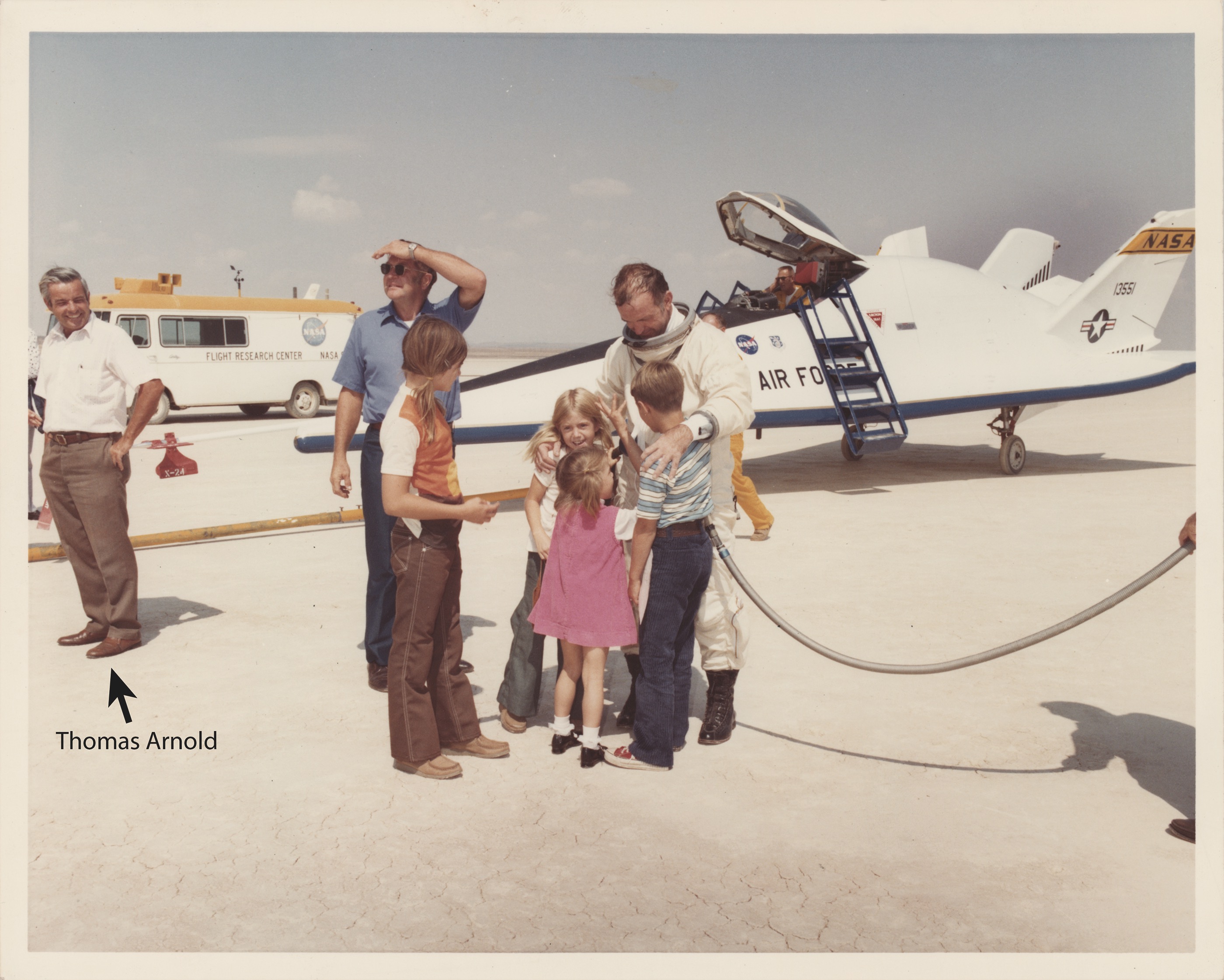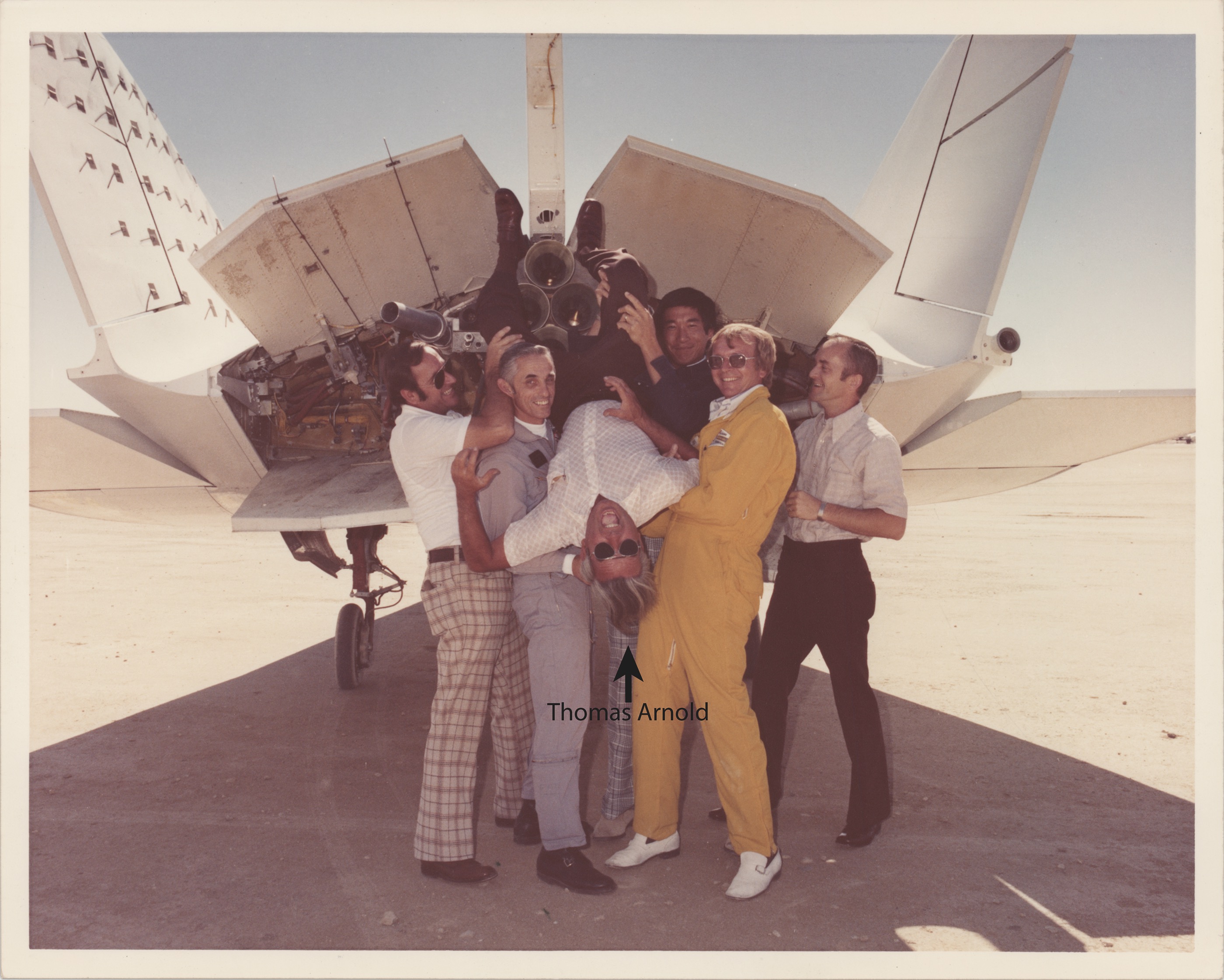 Personal records include Arnold’s handwritten flight-line notebook with engine data recorded during operations at Edwards, his pocket notebook, and an original X-15 flight log. The photographic archive features large-format Thiokol / Reaction Motors Division press photographs of XLR-11 static-fire tests, additional color and black-and-white engine test photographs, a mounted color image of the X-15 in powered flight, and personal snapshots of Arnold with colleagues beside the aircraft.