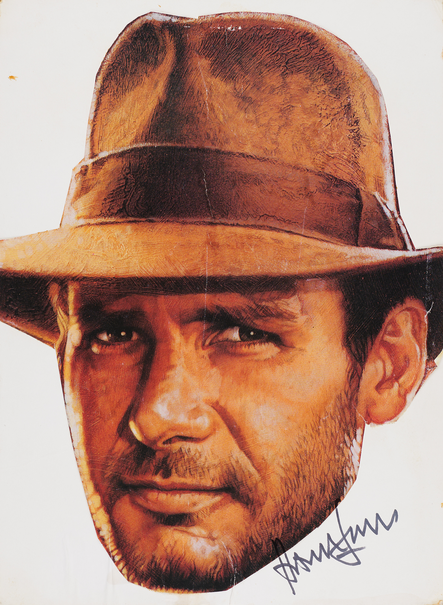 Felt tip signature, "Harrison Ford,” on an off-white 11 x 15 cardstock sheet bearing a large affixed color 'floating head' image of Ford as Indiana Jones. In very good to fine condition, with wrinkling and creasing to the image from being mounted, not affecting the bold signature.