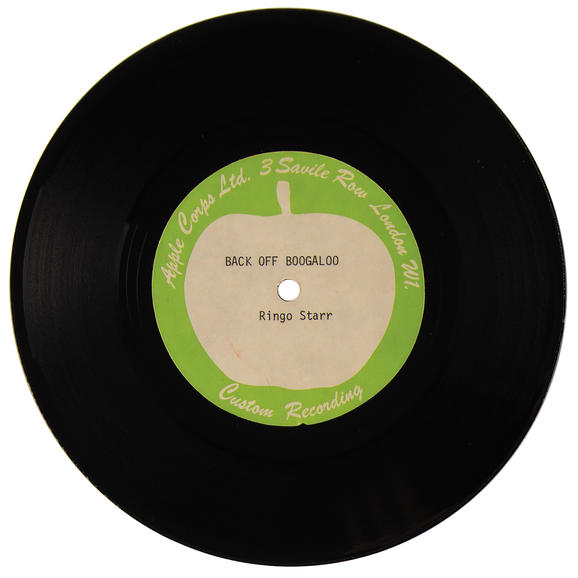 Desirable 7˝ UK Apple Records one-sided acetate pressing of Ringo Starr's classic "Back Off Boogaloo" in stereo (Apple R5944, 1972), recorded in August of 1971 and featuring Ringo (on drums), Pete Ham and George Harrison (on guitar), Klaus Voorman (on bass), and Gary Wright (keyboards). According to Ringo, glam rocker Marc Bolan of T-Rex inspired him to write the song after an evening of Marc continuing to say 'back off' and 'boogaloo.' The acetate disc bears a green-and-white Apple Corps Ltd. label with typed notations: "Back Off Boogaloo, Ringo Starr."