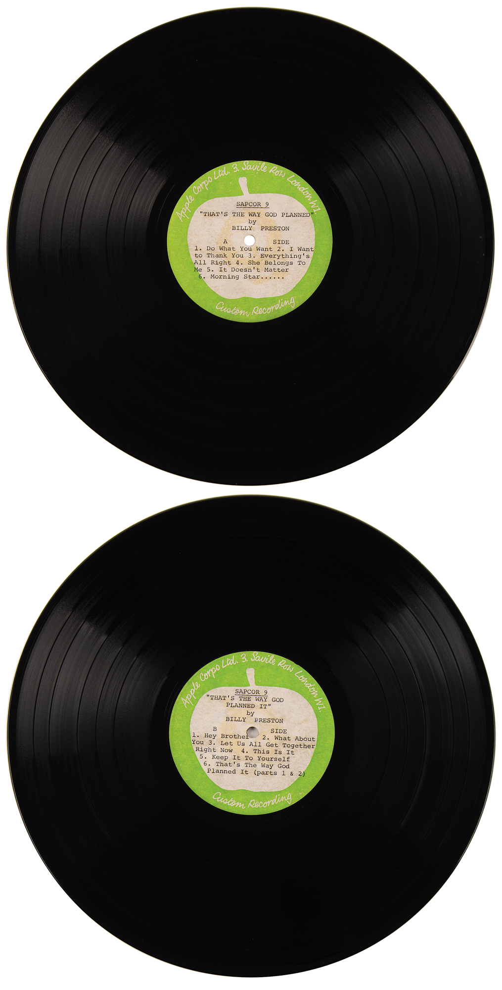 Two 12˝ UK Apple Records single-sided vinyl test pressings for each side of Billy Preston's 1969 studio album That's the Way God Planned It (SAPCOR 9, 1969), with green-and-white Apple Corps Ltd. labels filled out in type. The test pressings sport very early matrix numbers of "SAPCOR 9-A-3" (Side 1) and "SAPCOR 9-B-3" (Side 2).