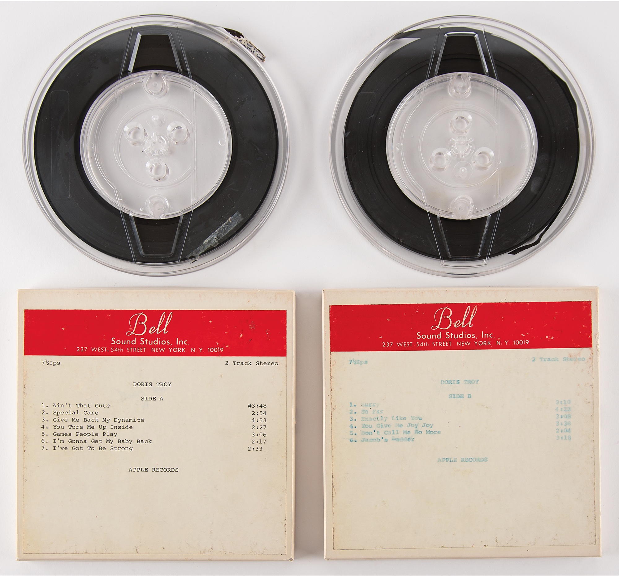 Two 7” US Bell/Apple master tape recordings for each side of for American soul singer Doris Troy's 1970 studio album Doris Troy (Apple ST 3371, 1970), created during the actual production of the album at Bell Sound Studios in New York under the command of legendary engineer Sam Feldman. These tapes would have been a direct copy from the original Bell Master Tapes for final review and approval just before it went into album production. Given they were made directly from the master tapes, the sound quality from the reels is incredibly vibrant with detail not heard on the album release. Each box boasts a typed track listing on the front.