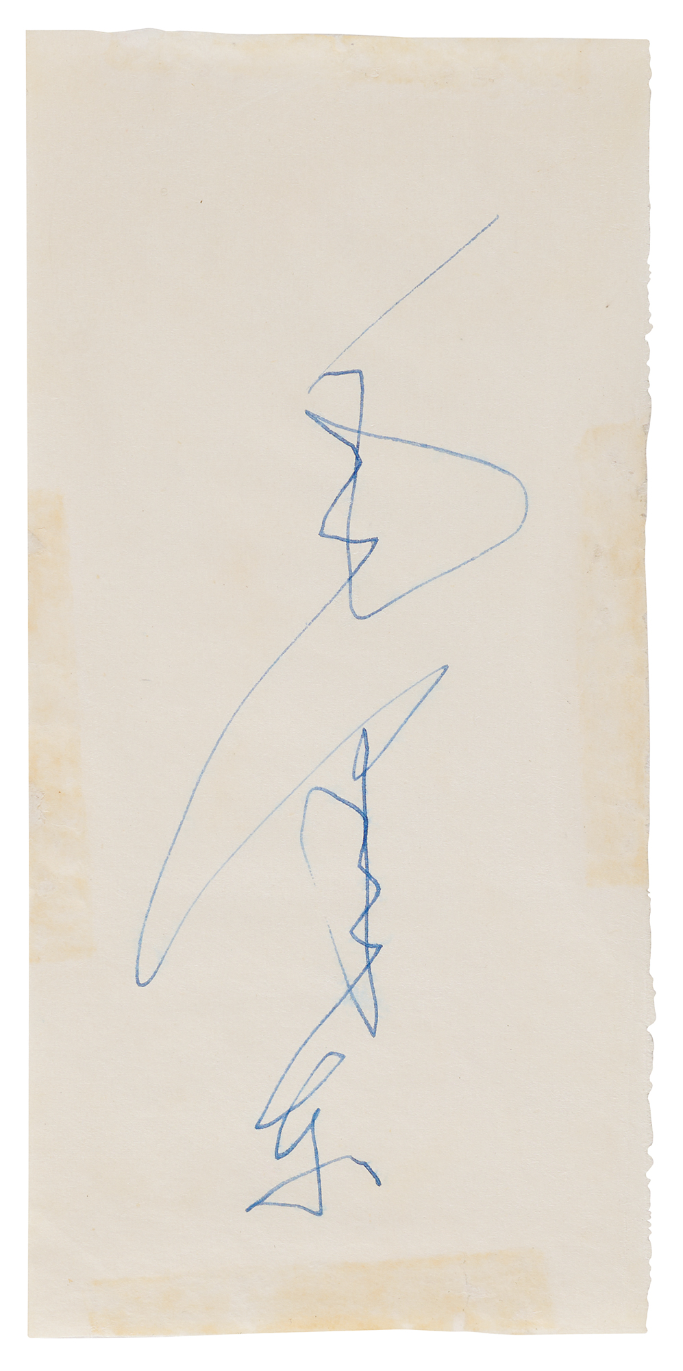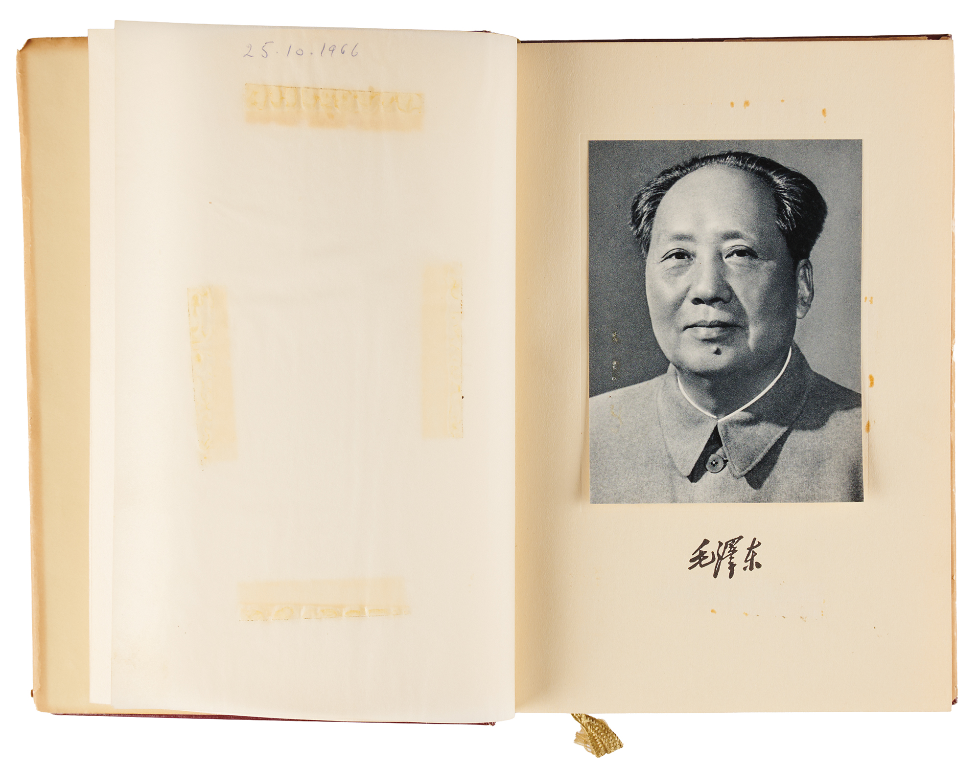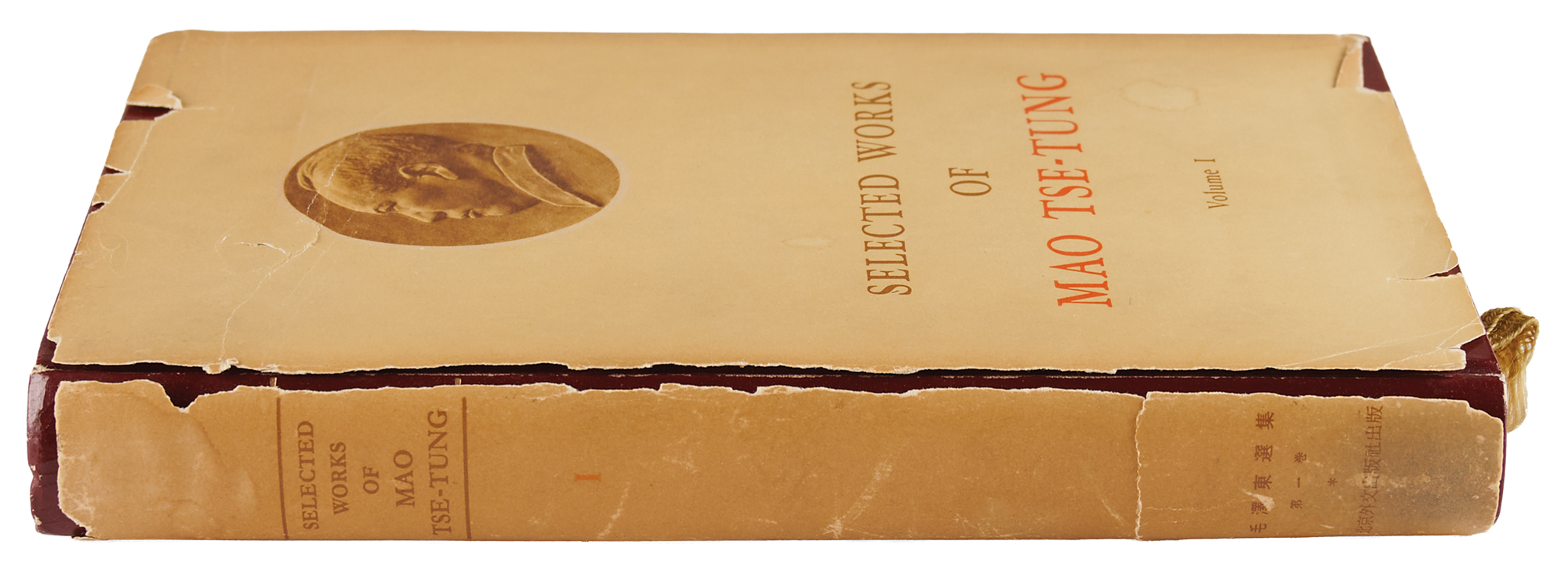Rare and highly sought vintage fountain pen signature by Mao Zedong on an off-white 3 x 6.25 slip, removed from an included first edition of Selected Works of Mao Tse-Tung, Vol. 1 (Peking: Foreign Languages Press, 1965). The signature was acquired on October 25, 1966, by the wife of Pakistani diplomat Sultan Mohammed Khan, who was then serving as ambassador to China; she taped the slip into the book, with a date notation ("25.10.1966") above. The signature has since been removed, and is in fine condition, with professionally cleaned tape stains to the edges, easily matted out; the book is included for provenance purposes, and has splits and tears to the dust jacket.