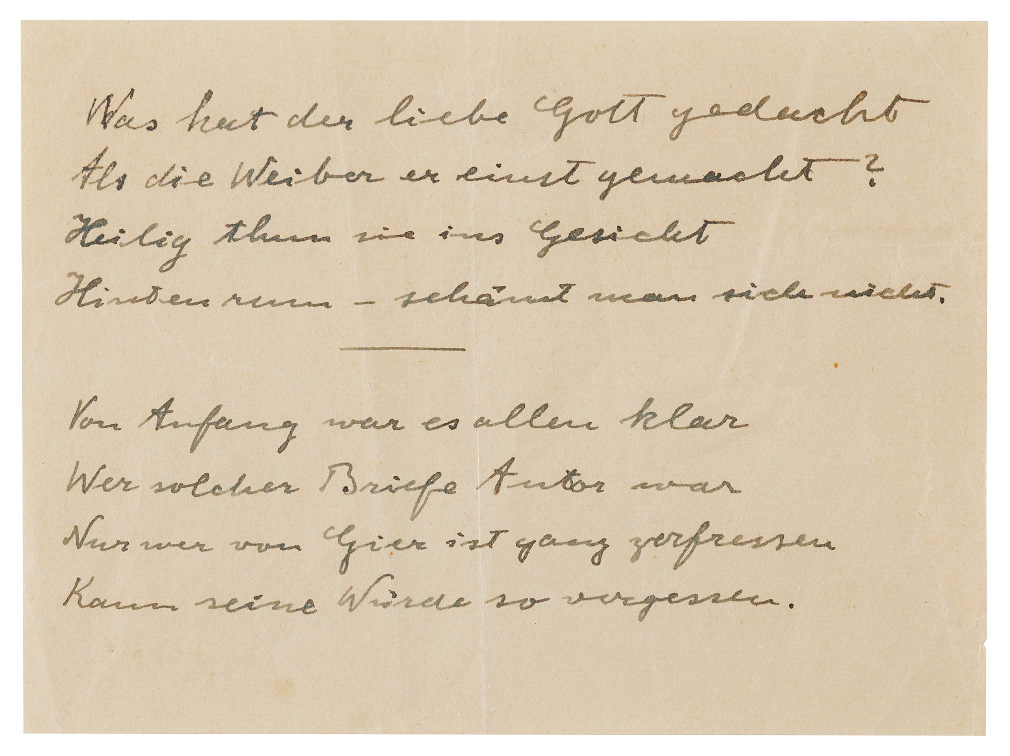 Interesting pair of unsigned handwritten poems in German by Albert Einstein, one page, 4 x 3, no date. Einstein pens two epigrammatic quatrains, in full (translated): "What was the good Lord thinking when he created women, giving them the face of saints, but shameless from behind? / From the outset, there was no doubt about the author of such letters; only those consumed by greed could so completely forget their dignity." In fine condition, with a light central vertical fold.
