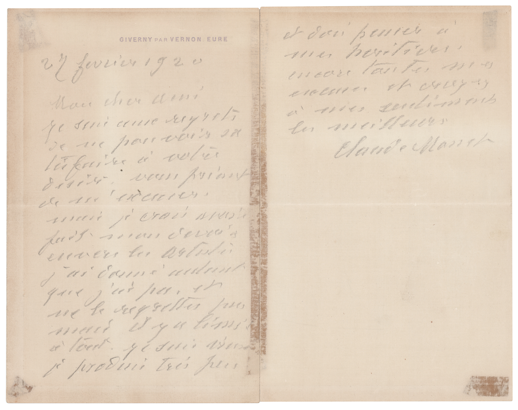 ALS in French, two pages on two adjoining sheets, 5 x 8, Giverny par Vernon letterhead, February 27, 1920. Handwritten letter to a friend, in part (translated): "I am sincerely sorry not to be able to answer your request, please forgive me but I believe I did my duty for the artists. I gave as much as I could and have no regrets but there is a limit to everything. I am old and produce very little. Once again my deepest regret and my best regard." In very good to fine condition, with old tape stains to the corners, and to the separated hinge.
