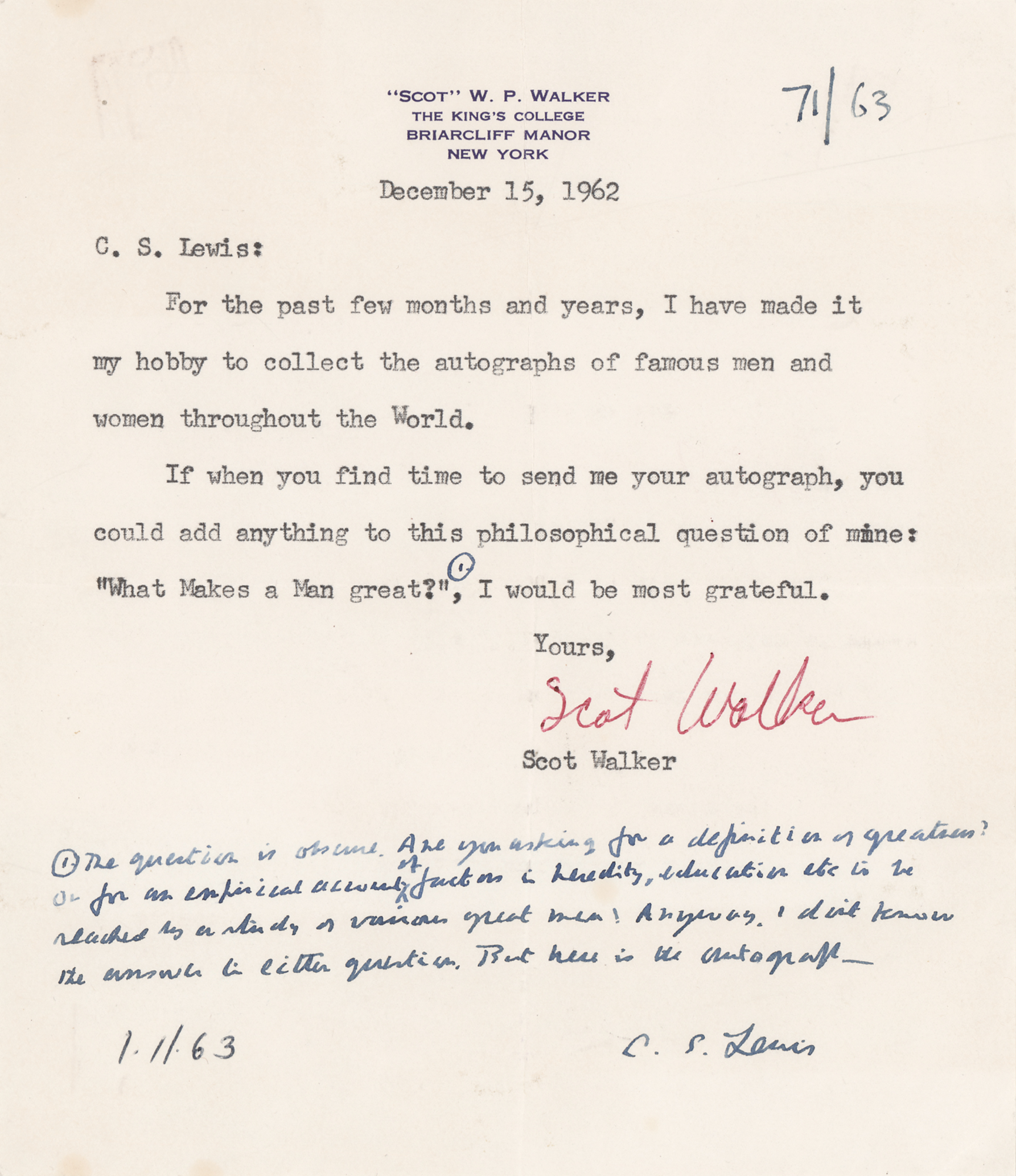 Influential Irish author and scholar (1898-1963), a former atheist who became an eloquent convert to Christianity, best known for his works on Christian theology and his much-beloved, seven-book juvenile fantasy series The Chronicles of Narnia. ANS signed “C. S. Lewis,” one page, 6 x 7, 'Scot' W. P. Walker letterhead, December 15, 1962. Handwritten response to autograph collector Scot Walker's inquiry, "What Makes a Man great?," penned in the lower margin of the letter sent to him. Lewis writes, in full: "The question is obscure. Are you asking of a definition of greatness? Or for an empirical account of factors in heredity, education, etc. to be reached by a study of various great men? Anyway, I don't know the answer to either question. But here is the autograph." In fine condition.