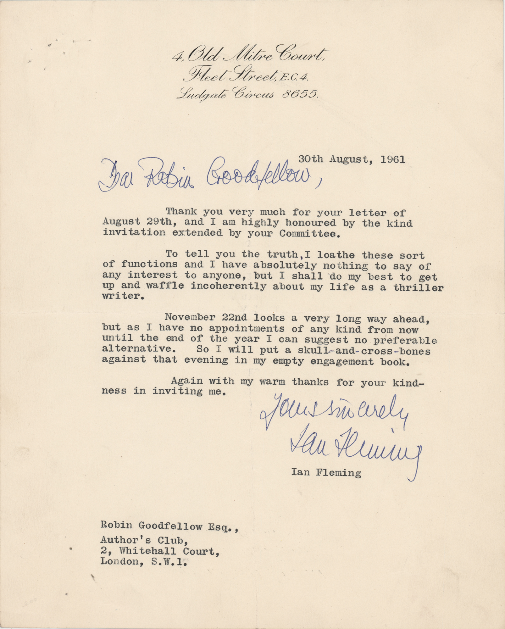TLS signed “Yours sincerely, Ian Fleming,” one page, 8 x 10, 4 Old Mitre Court letterhead, August 30, 1961. Letter to Robin Goodfellow of the Author's Club, London, in part: "I am highly honoured by the kind invitation extended by your Committee. To tell you the truth, I loathe these sort of functions and I have absolutely nothing to say of any interest to anyone, but I shall do my best to get up and waffle incoherently about my life as a thriller writer. November 22nd looks a very long way ahead, but as I have no appointments of any kind from now until the end of the year I can suggest no preferable alternative. So I will put a skull-and-cross-bones against that evening in my empty engagement book." In fine condition.