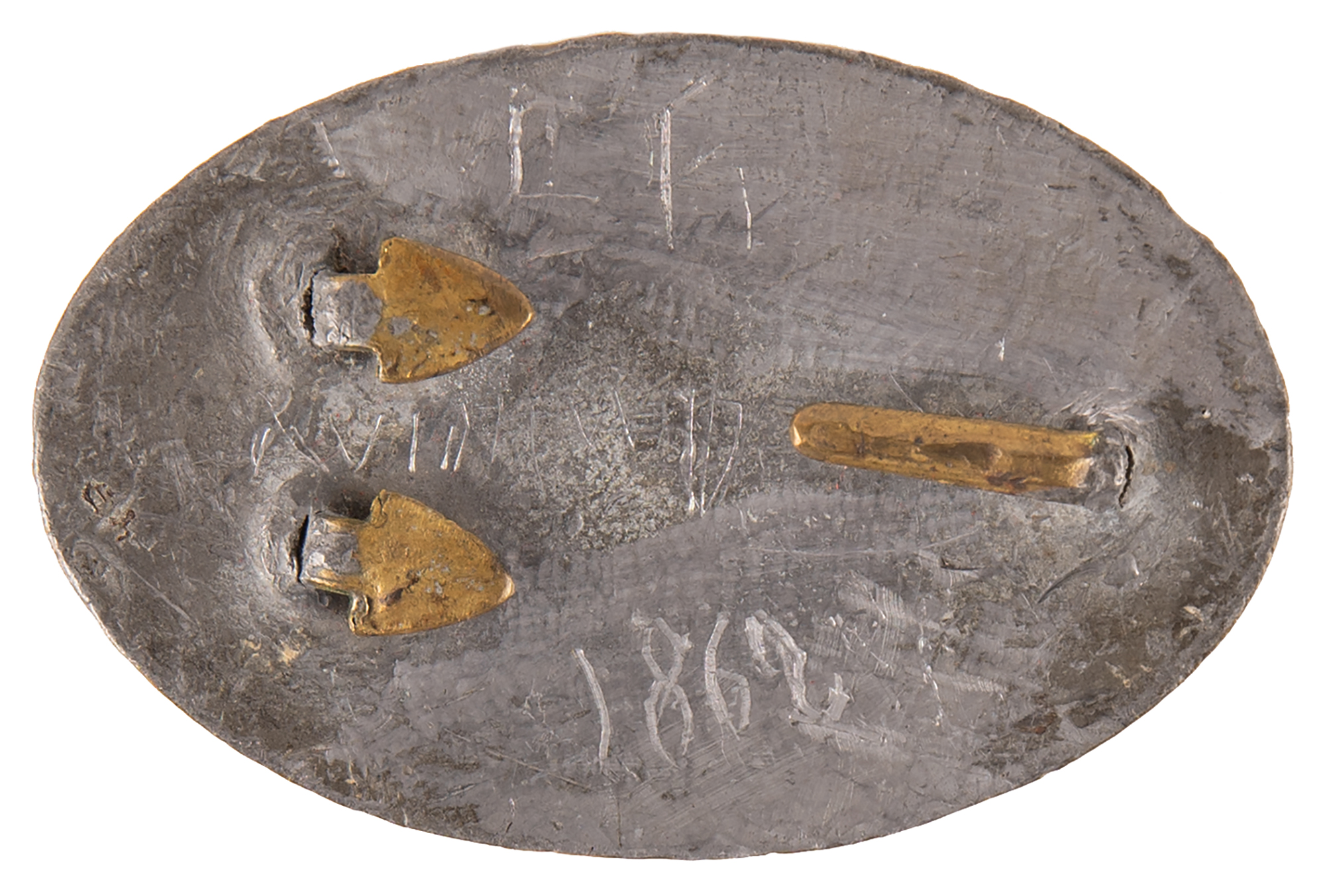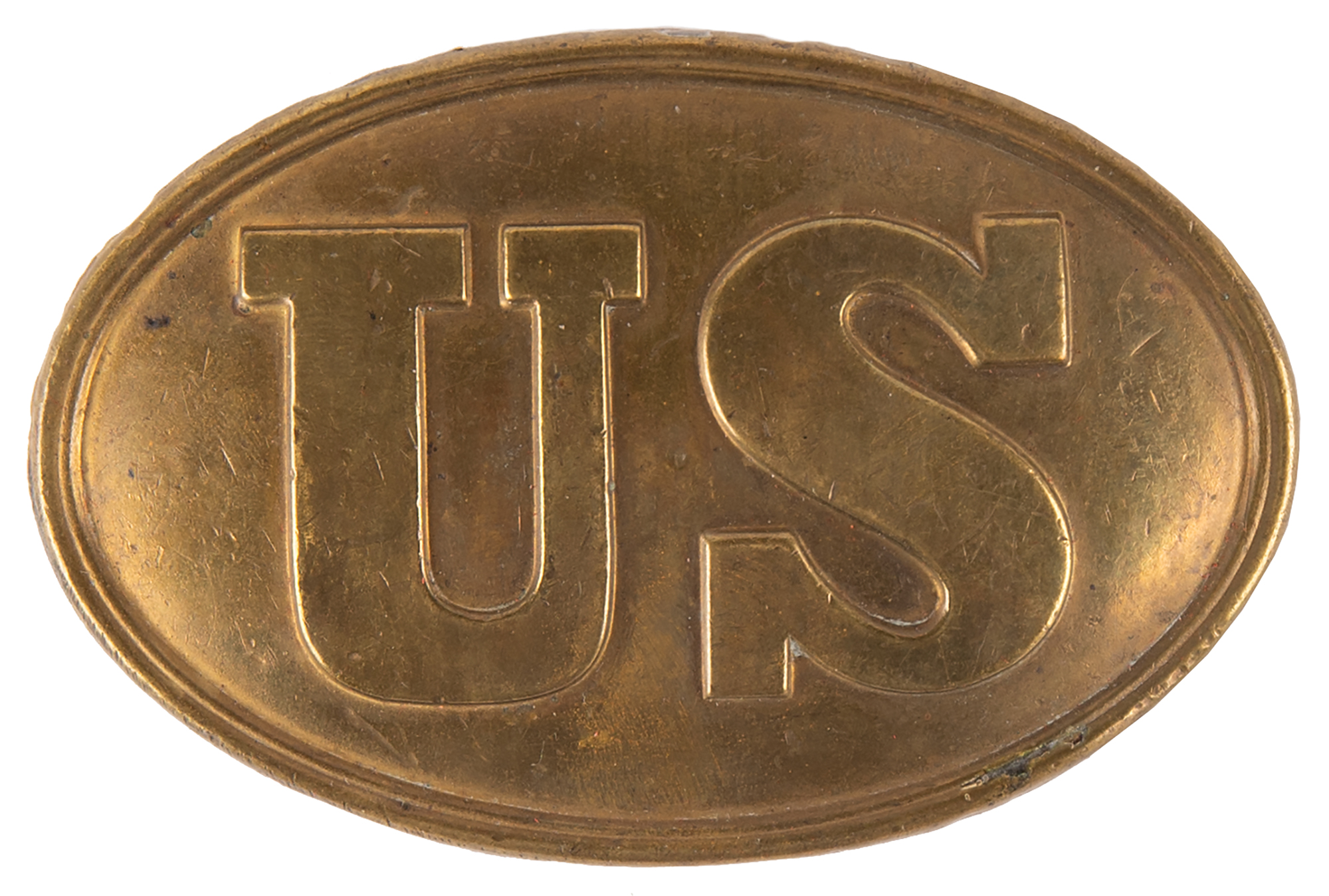 Non-excavated brass, die-struck, lead-filled Civil War US 1839 pattern oval belt plate measuring 3 1/2" across. The brass has an overall dull yellow-ochre patina with some small dents and faint surface scratches scattered across the face, but the "US" and double-beaded border are still clear and well-defined. The reverse has typical Civil War era arrowhead studs, with practically all of the original lead filling still in place. There are illegible scratches present, perhaps a previous owner’s name or unit, but the date "1862" is still legible. The plate is housed in a small Riker box with red cloth backing, and is a very good example of a Civil War era waist belt plate.
