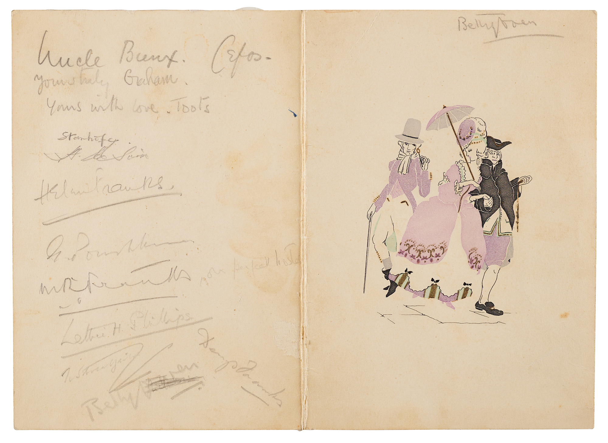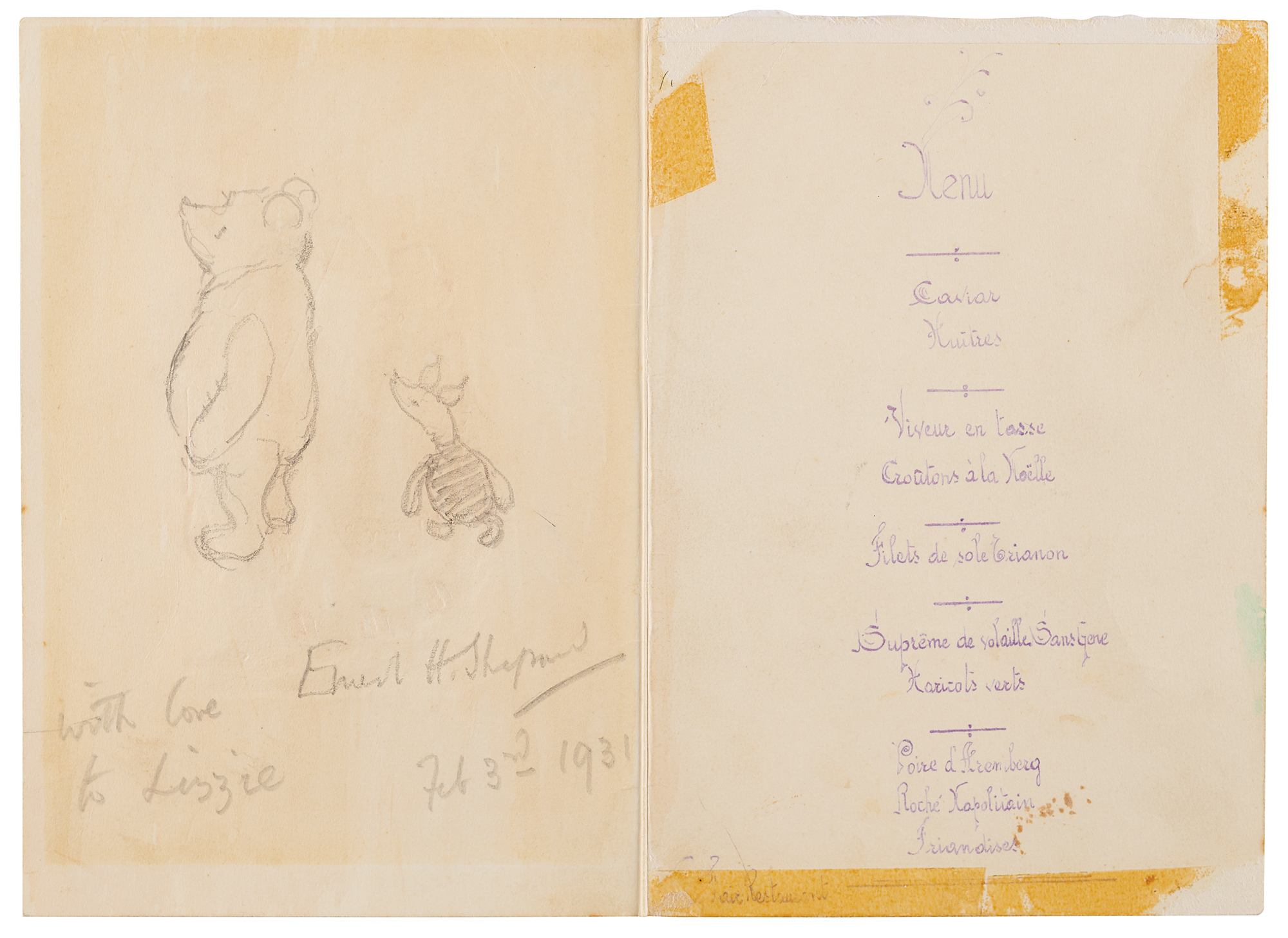 English artist and book illustrator (1879-1976) known especially for his human-like animals in illustrations for Winnie-the-Pooh by A. A. Milne. Charming original pencil sketch of Winnie-the-Pooh and Piglet accomplished by Ernest Shepard inside a 4.75 x 7 luncheon menu card, signed and inscribed below, "With love to Lizzie, Ernest H. Shepard, Feb. 3rd, 1931." Also signed on the card's reverse by other attendees. In very good to fine condition, with soiling and old tape stains, and toning to the signed panel from prior display.