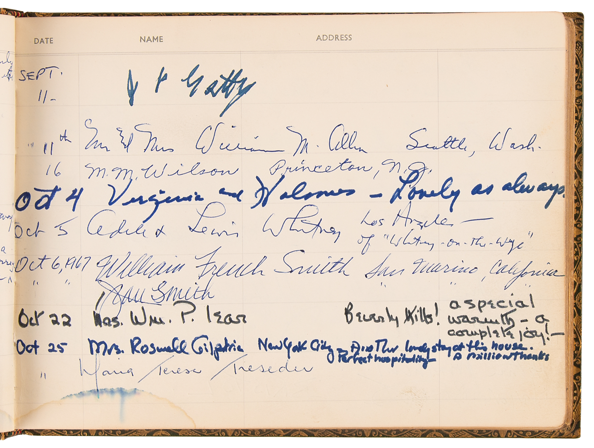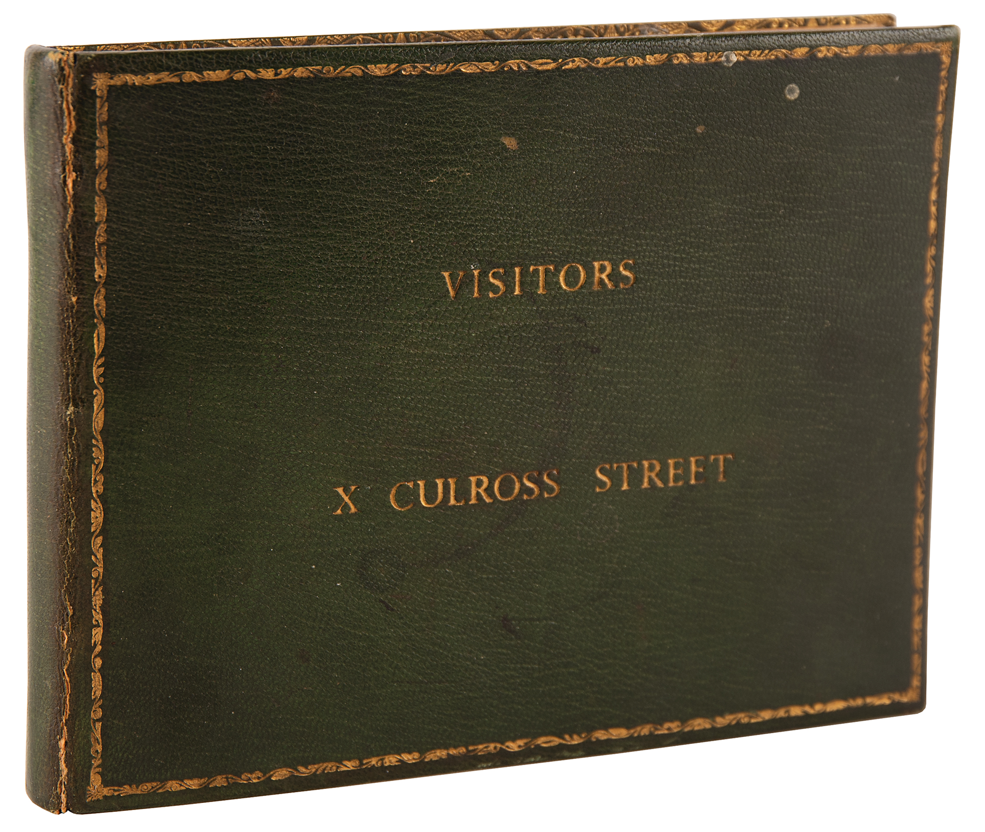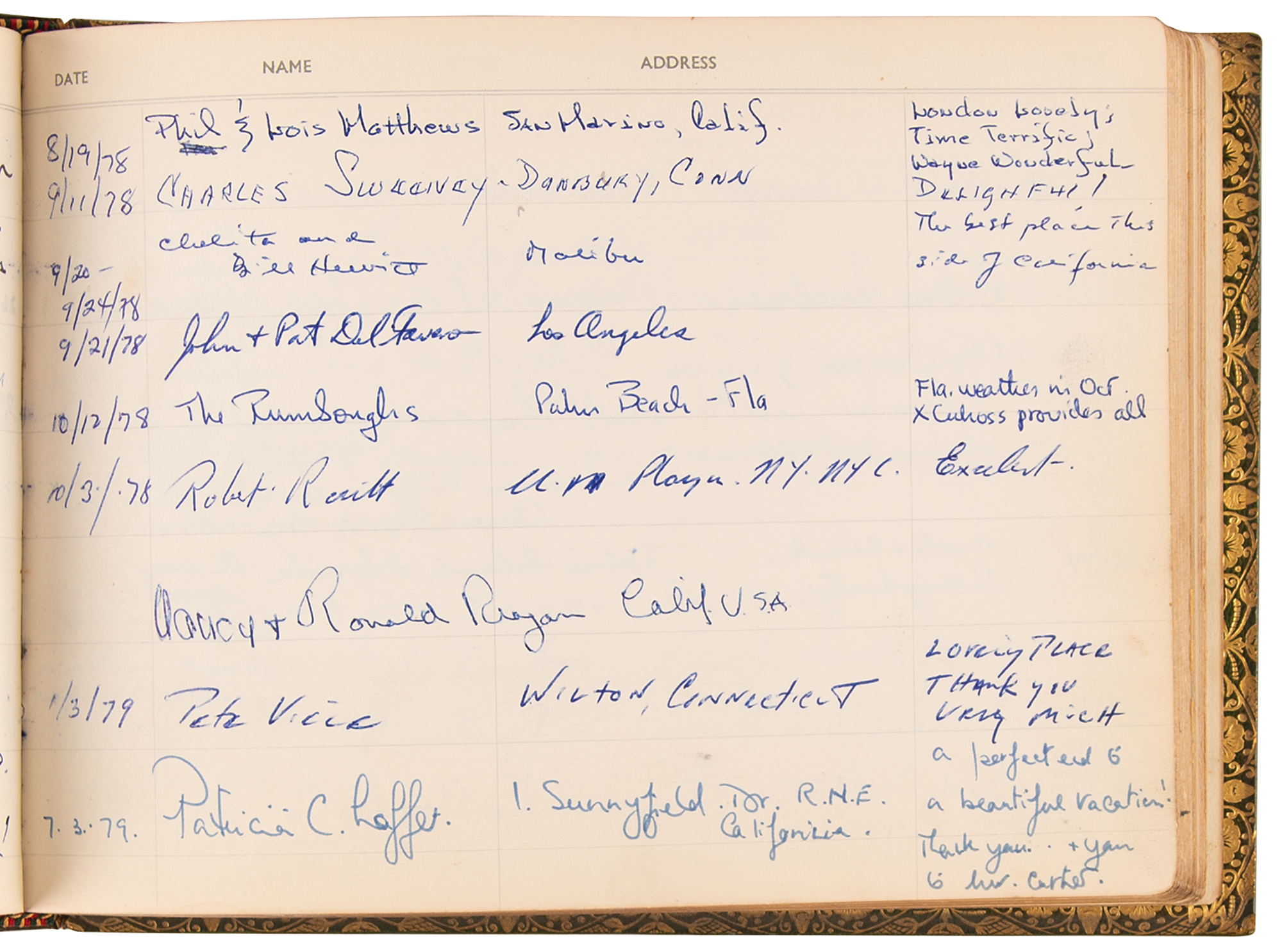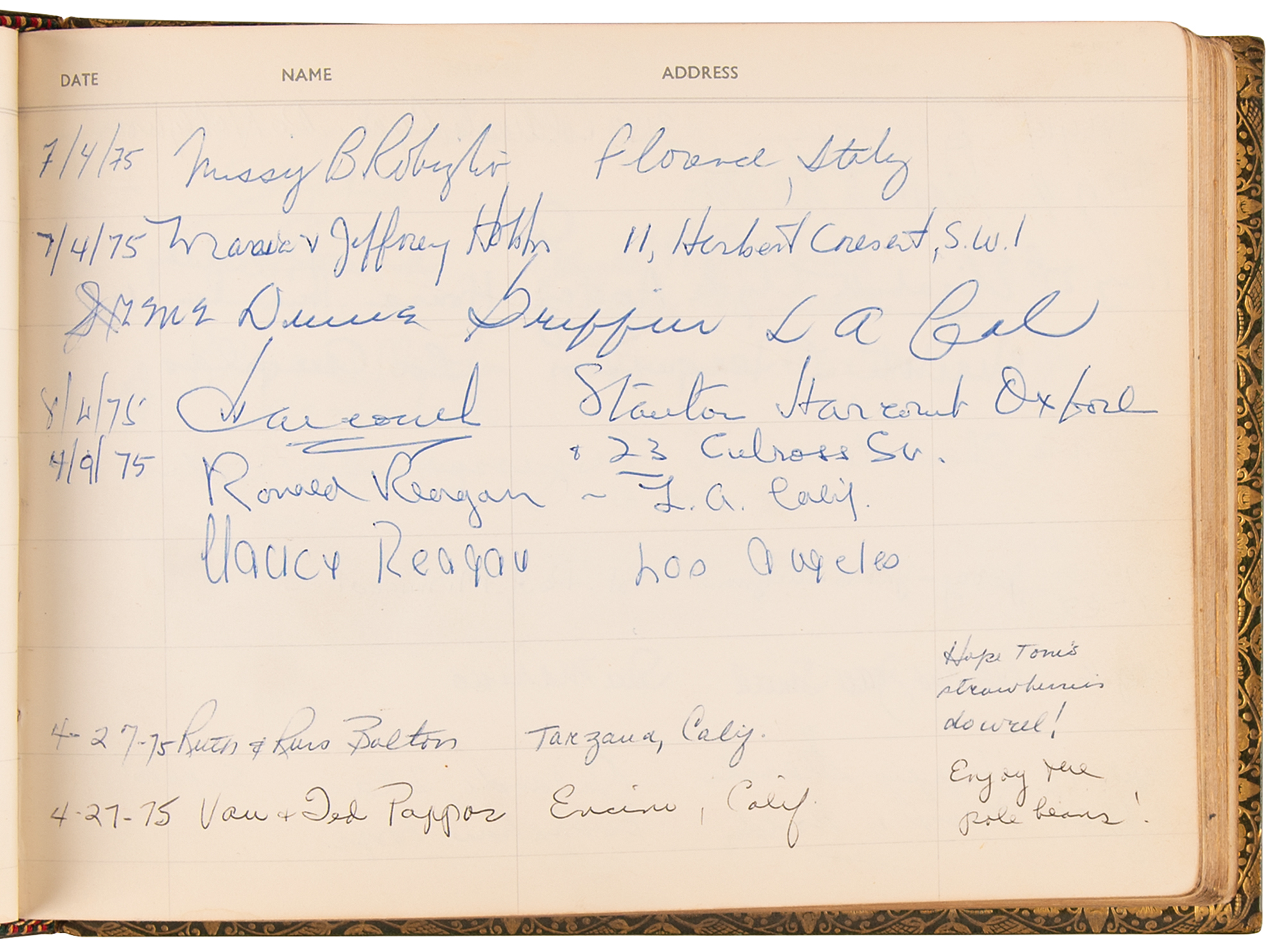 Leatherbound guest book signed by a variety of visitors to London, 8 x 6, gilt-stamped on the front cover: "Visitors, X Culross Street." Signed inside by dozens of individuals, spanning the years 1964 to 1986, including: Ronald Reagan (2), Nancy Reagan (3), J. P. Getty, Walter Annenberg, and Helen Hayes, with few other names of note. In fine condition.