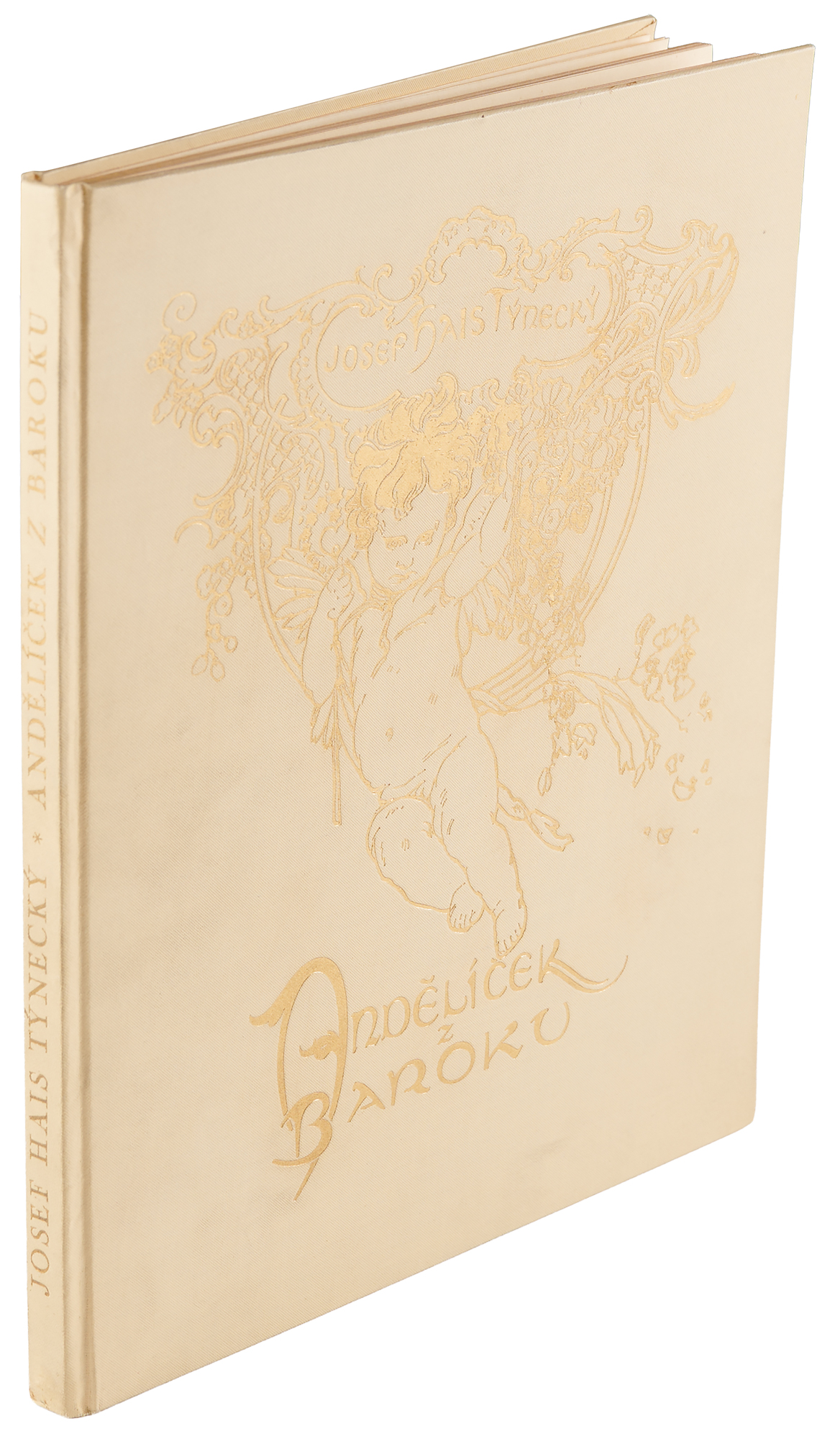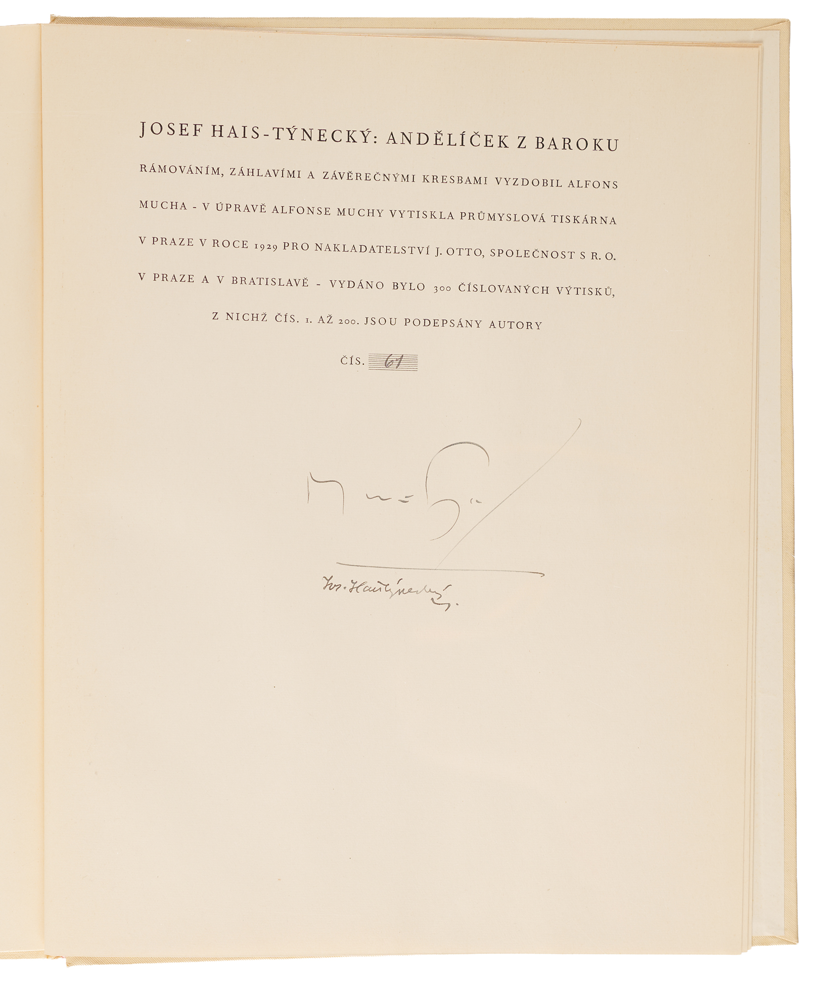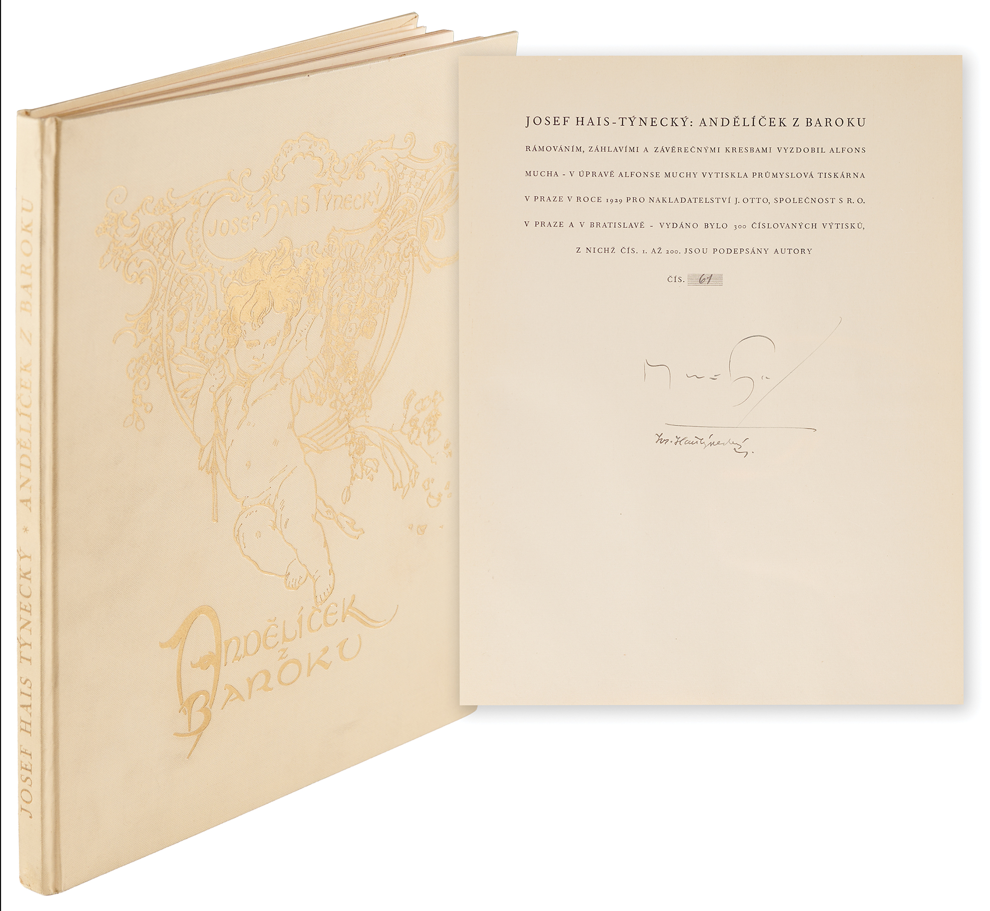 Signed Czech-language book: Andelicek z Baroku. Limited edition, numbered 61 of 200 signed copies. Prague: J. Otto, 1929. Cloth-bound hardcover gilt-decorated front board and spine, with original publisher’s slipcase, 8.5 x 10.25, 103 pages. Signed in ink on the colophon, "Mucha," and by the author, Josef Hais-Tynecky. The work contains 37 vignettes and decorative frames (so-called 'shellwork') by Alphonse Mucha. Autographic condition: fine. Book condition: VG/None. A scarce and desirable luxury publication featuring extensive ornamental designs and decorative vignettes by Art Nouveau master Alphonse Mucha.