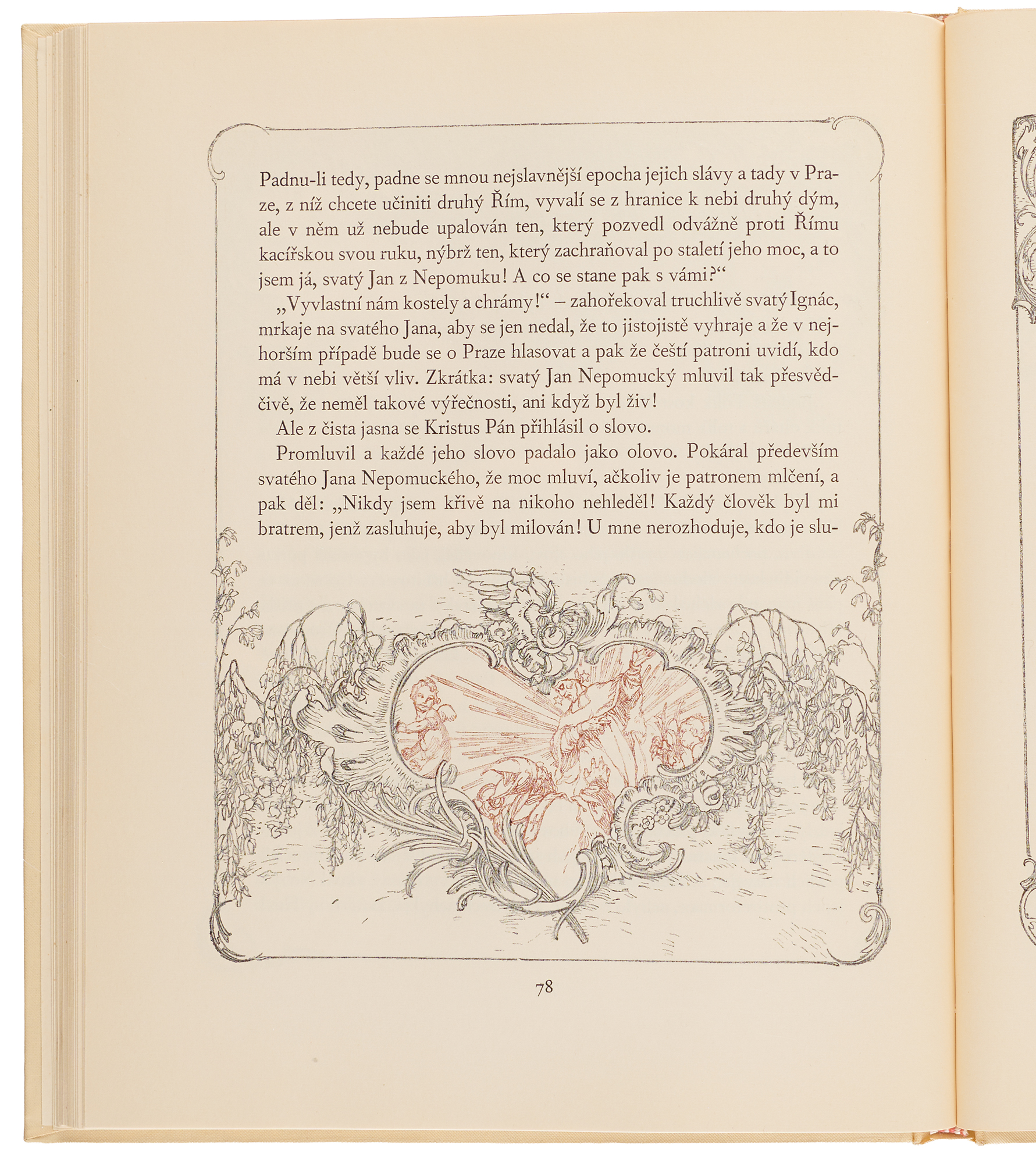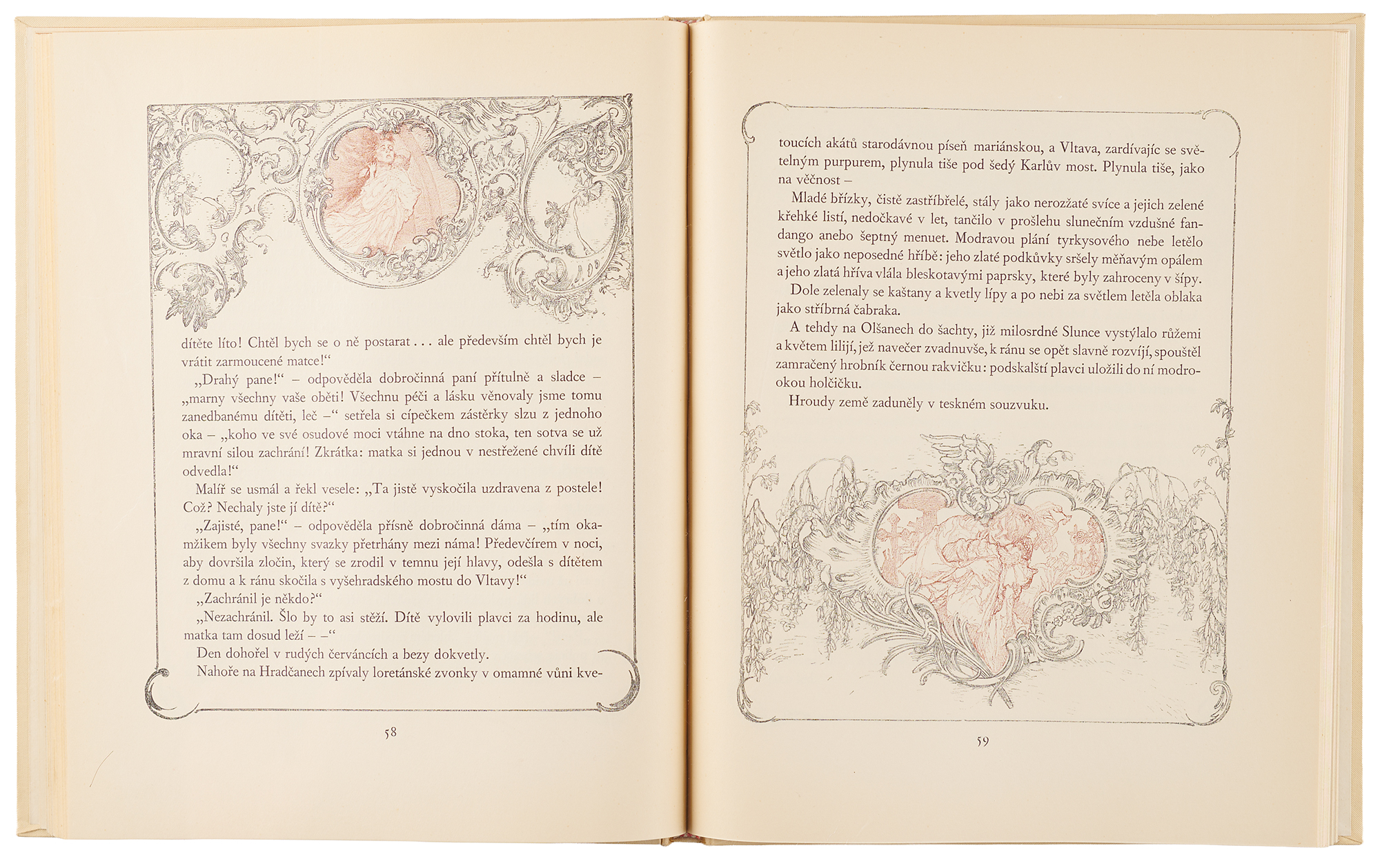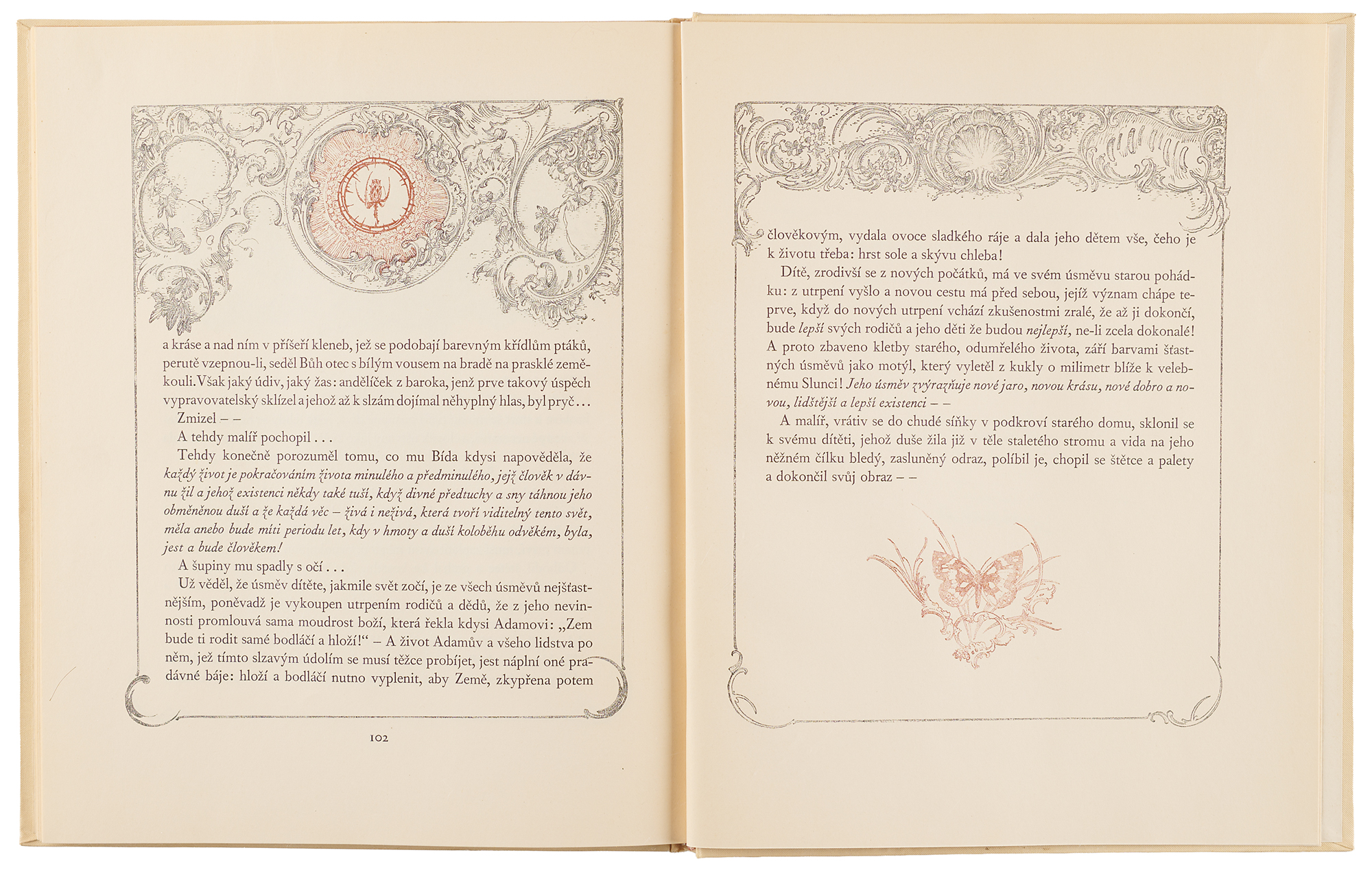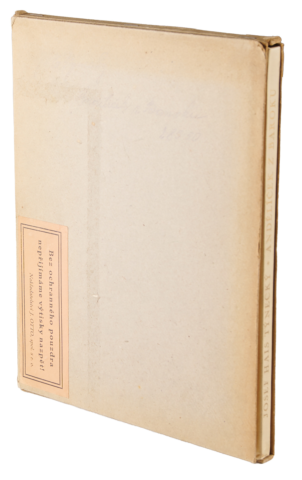 Signed Czech-language book: Andelicek z Baroku. Limited edition, numbered 61 of 200 signed copies. Prague: J. Otto, 1929. Cloth-bound hardcover gilt-decorated front board and spine, with original publisher’s slipcase, 8.5 x 10.25, 103 pages. Signed in ink on the colophon, "Mucha," and by the author, Josef Hais-Tynecky. The work contains 37 vignettes and decorative frames (so-called 'shellwork') by Alphonse Mucha. Autographic condition: fine. Book condition: VG/None. A scarce and desirable luxury publication featuring extensive ornamental designs and decorative vignettes by Art Nouveau master Alphonse Mucha.