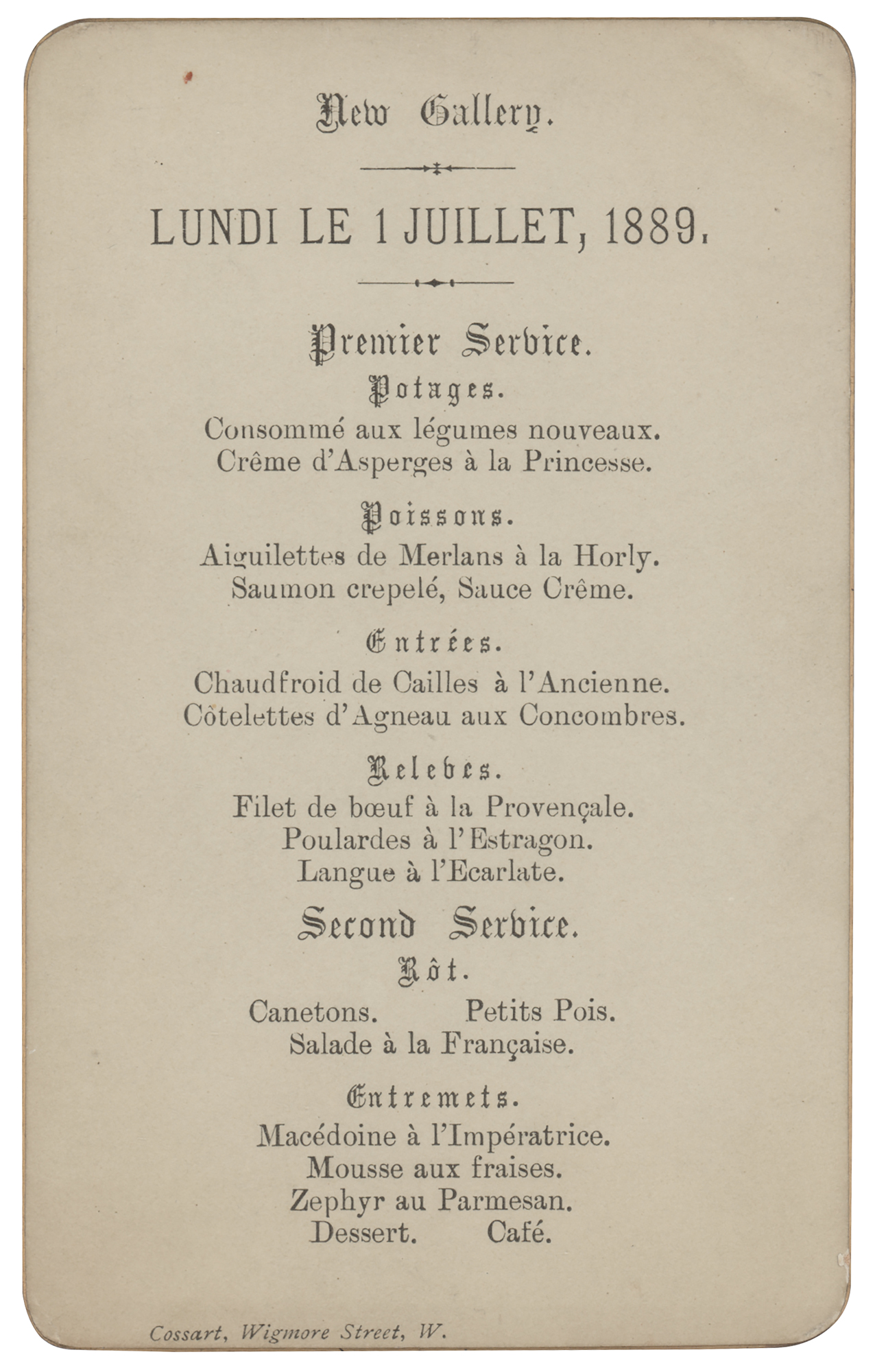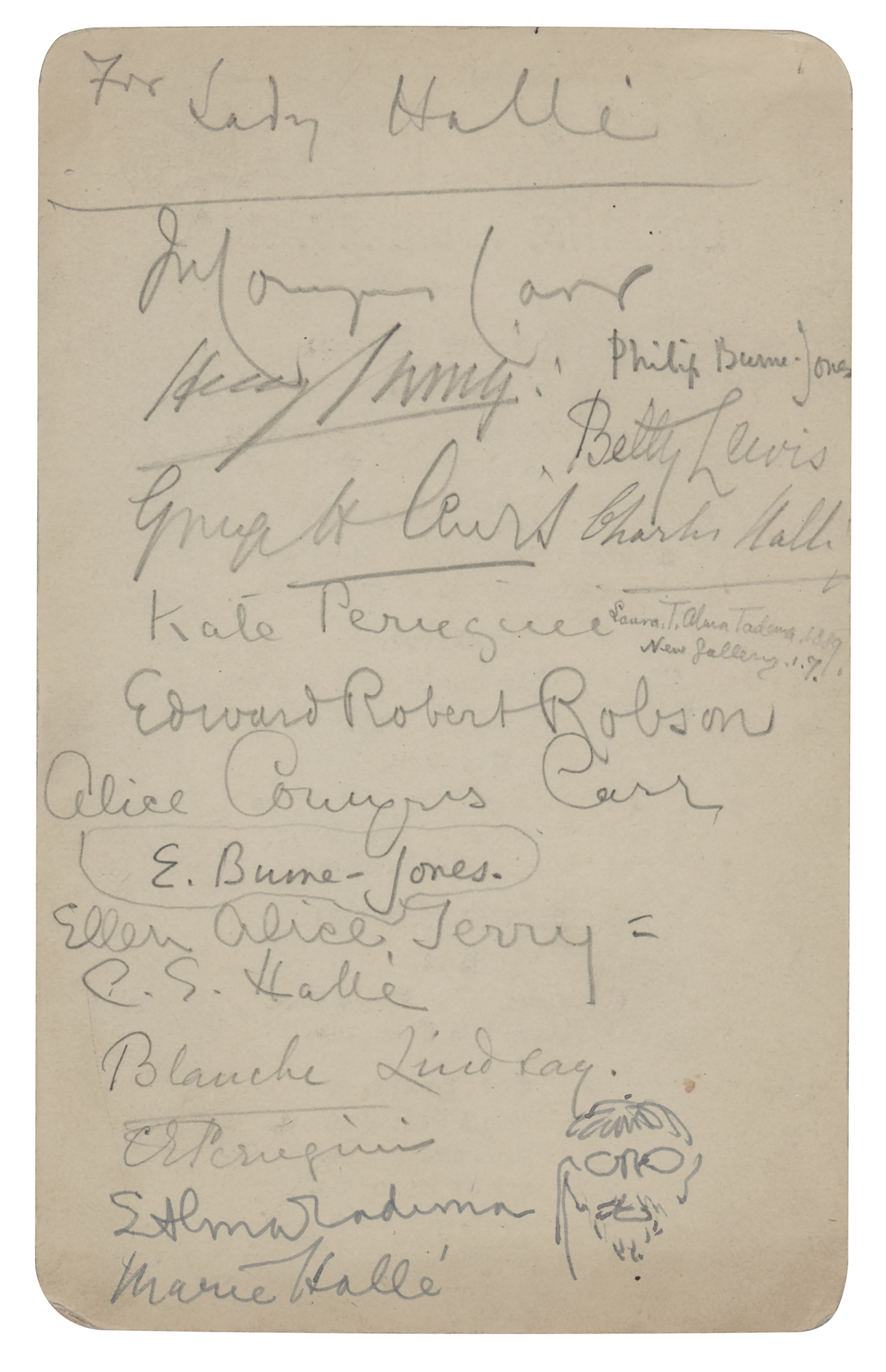 Dutch painter (1836-1912) famed for his exotic portrayals of the luxury and decadence of antiquity. Pencil signature, “L. Alma-Tadema,” with a small original self-portrait sketch on the reverse of an off-white 3.5 x 5.5 menu from the restaurant at the London art gallery New Gallery, dated to July 1, 1889, which is signed by 16 others, including actor Henry Irving, writer and art critic J. Comyns Carr, painter Philip Burne-Jones, architect Edward Robert Robson, painter and designer Edward Burne-Jones, actress Ellen Terry, and Alma-Tadema’s wife, Laura. In fine condition.