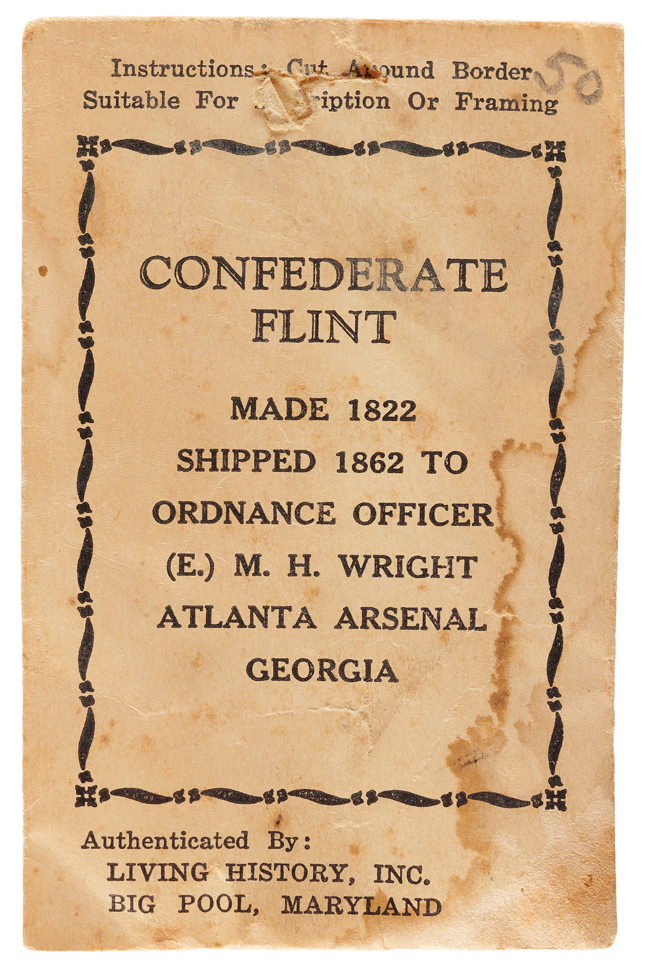 Piece of Confederate flint, measuring approximately 1.25˝ x 1˝, with its envelope from Living History, Inc., imprinted: "Confederate Flint, Made 1822, Shipped 1862 to Ordnance Officer (E.) M. H. Wright, Atlanta Arsenal, Georgia." In fine condition, with wrinkling to the envelope.