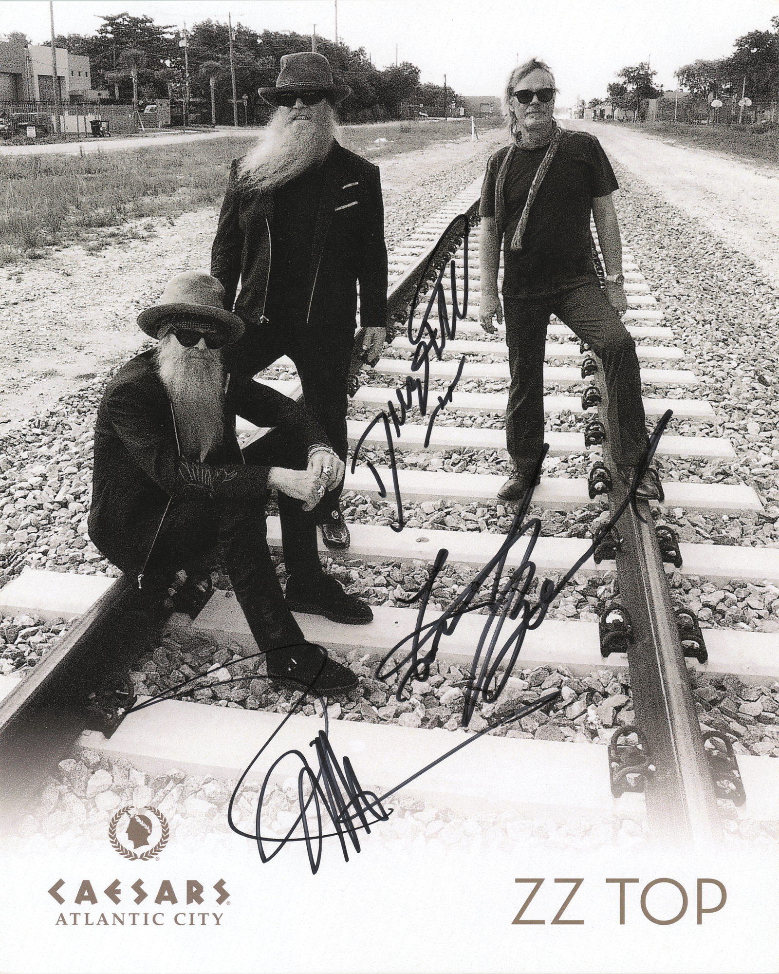 Semi-glossy 8 x 10 Caesars Atlantic City promotional photo of ZZ Top, signed in black felt tip by Billy Gibbons, Dusty Hill, and Frank Beard. In very fine condition.