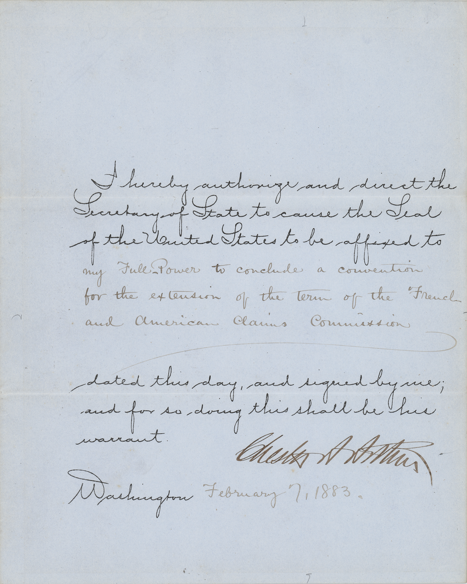 Partly-printed DS as president, one page, 8 x 10, February 7, 1883. President Arthur authorizes and directs the Secretary of State to cause the Seal of the United States to be affixed to “my Full Power to conclude a convention for the extension of the term of the French and American Claims Commission.” Prominently signed at the conclusion in ink by President Chester A. Arthur. In fine condition.