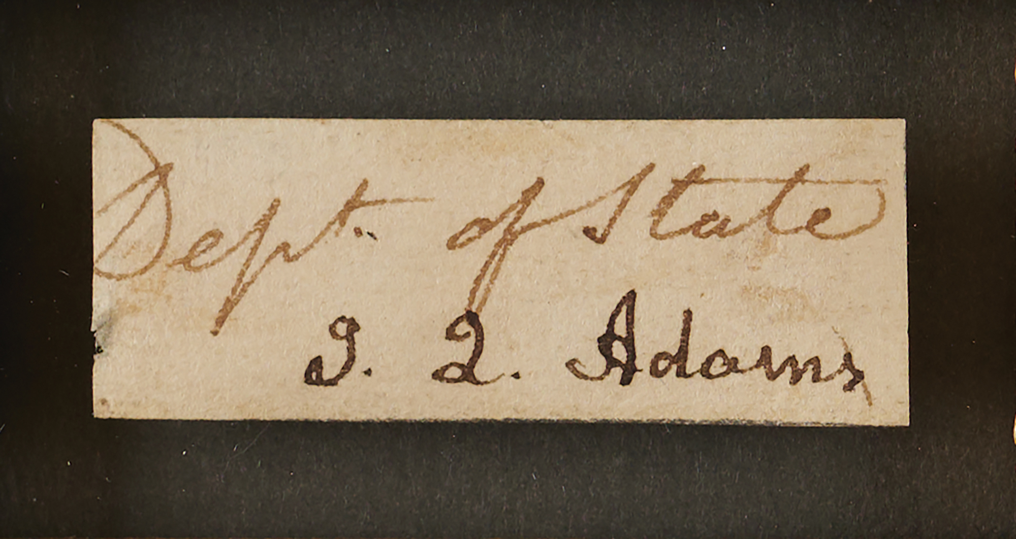 Ink signature, "J. Q. Adams,” on an off-white 1.75 x .75 slip that bears a secretarial annotation, “Dept. of State.” Impressively double-matted with an engraved plate and portrait to an overall size of 16.75 x 12.75. In fine condition. The presence of the ‘Department of State’ notation suggests that the signature may date to Adams’s tenure as Secretary of State, which lasted from 1817 to 1825.