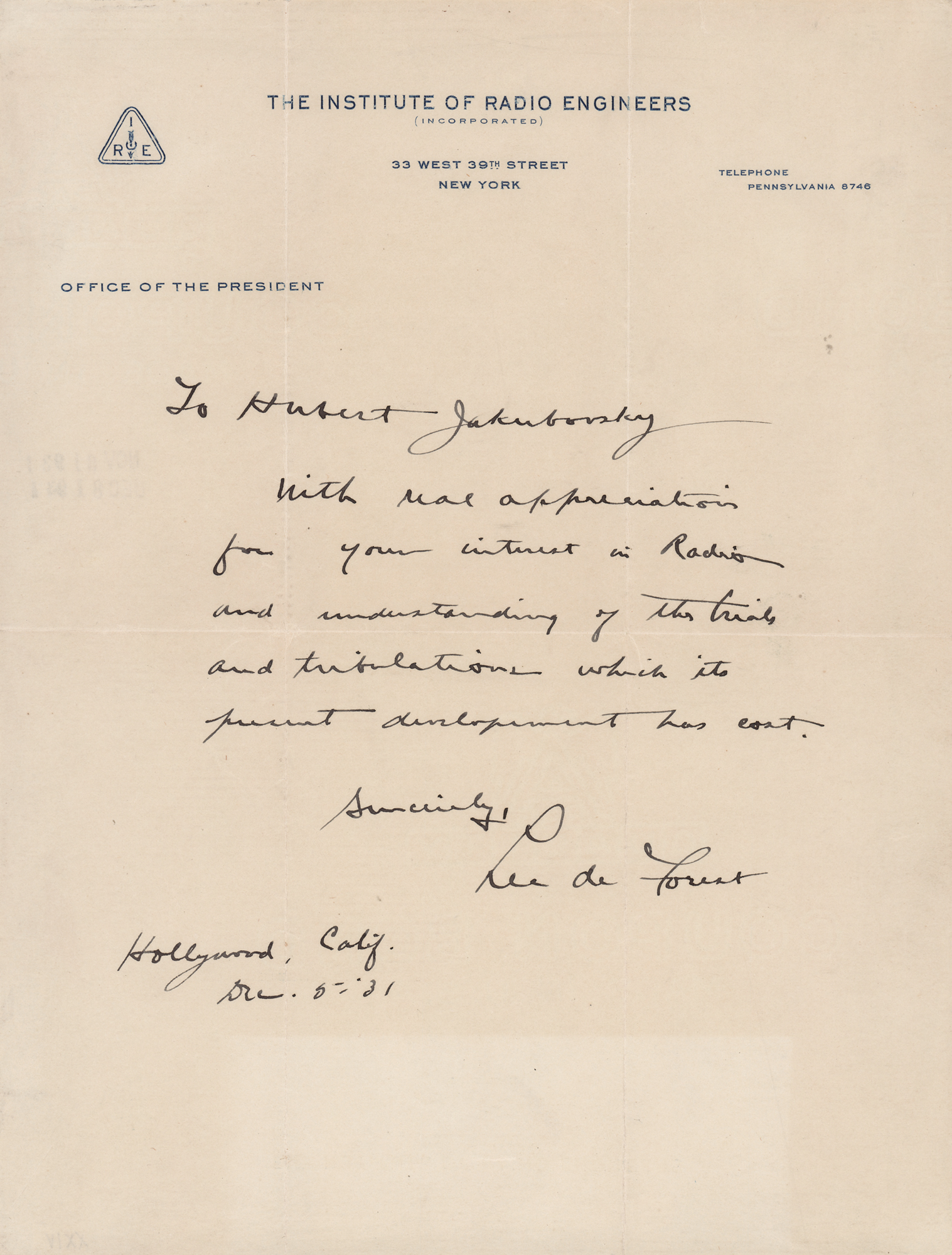 Prolific American inventor (1873-1961) often referred to as 'the father of radio' for his pioneering work in wireless telegraphy. ALS, one page, 8.5 x 11, The Institute of Radio Engineers (Office of the President) letterhead, December 5, 1931. Addressed from Hollywood, California, a handwritten letter to Hubert Jakubovsky, in full: “With real appreciation for your interest in Radio and understanding of the trials and tribulations which its present development has cost.” In fine condition.