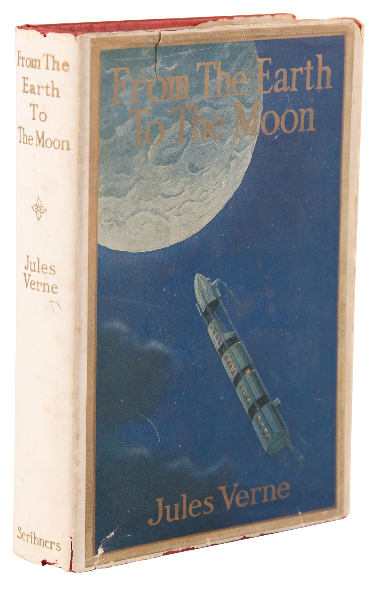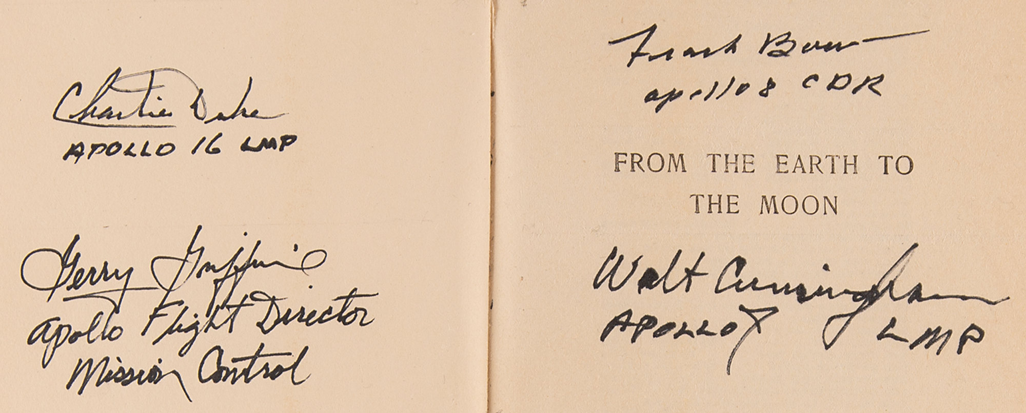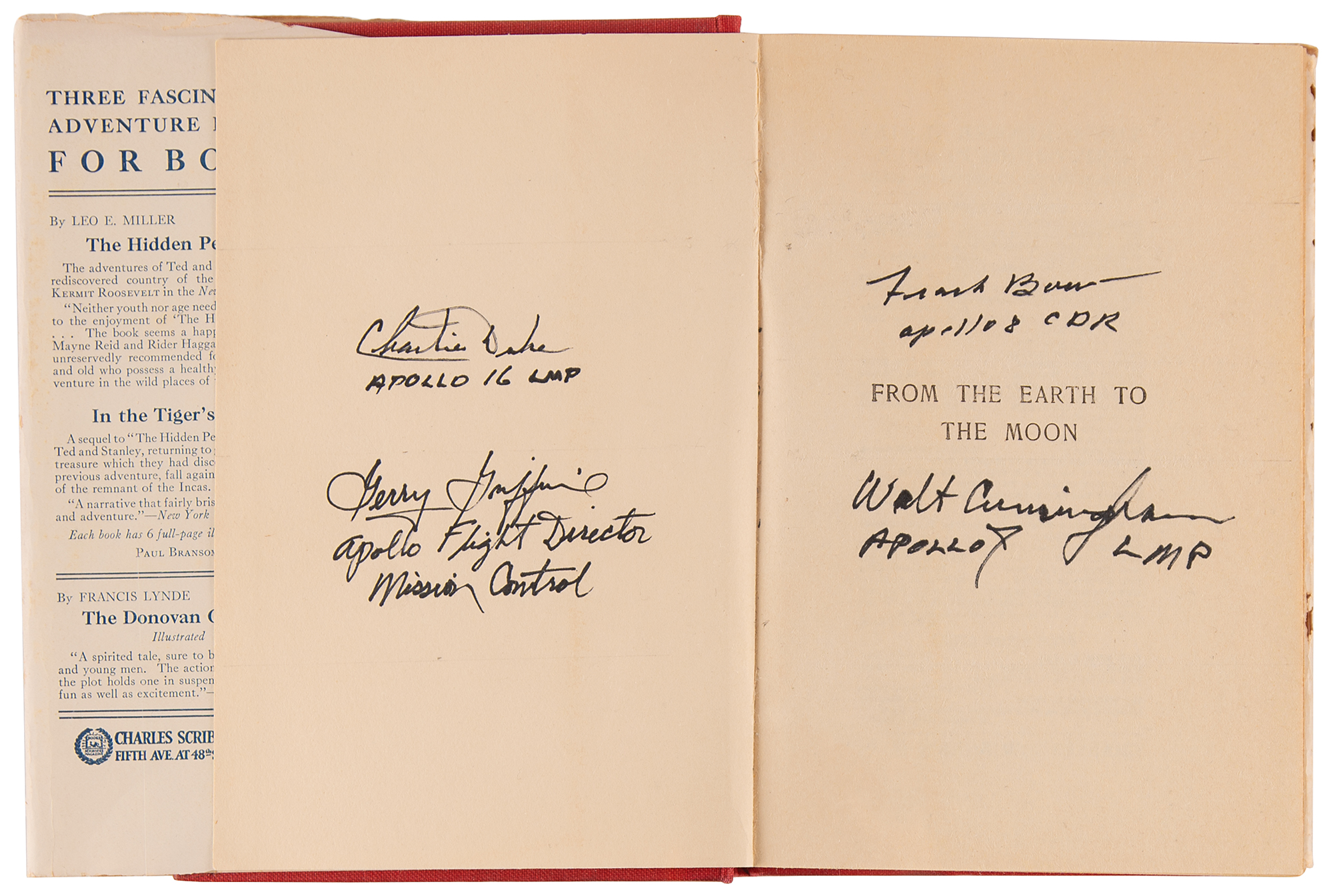 Signed book: From the Earth to the Moon. Later printing. NY: Charles Scribner's Sons, 1925. Hardcover with dust jacket, 5.25 x 7.75, 323 pages. Signed on half-title page and its facing page in black felt tip by three Apollo astronauts and one flight director: "Walt Cunningham, Apollo 7 LMP," "Frank Borman, Apollo 8 CDR," "Charlie Duke, Apollo 16 LMP," and "Gerry Griffin, Apollo Flight Director, Mission Control." Autographic condition: fine. Book condition: VG/G+, with an ownership inscription to the first free end page and some small edge chips and tears to the jacket.