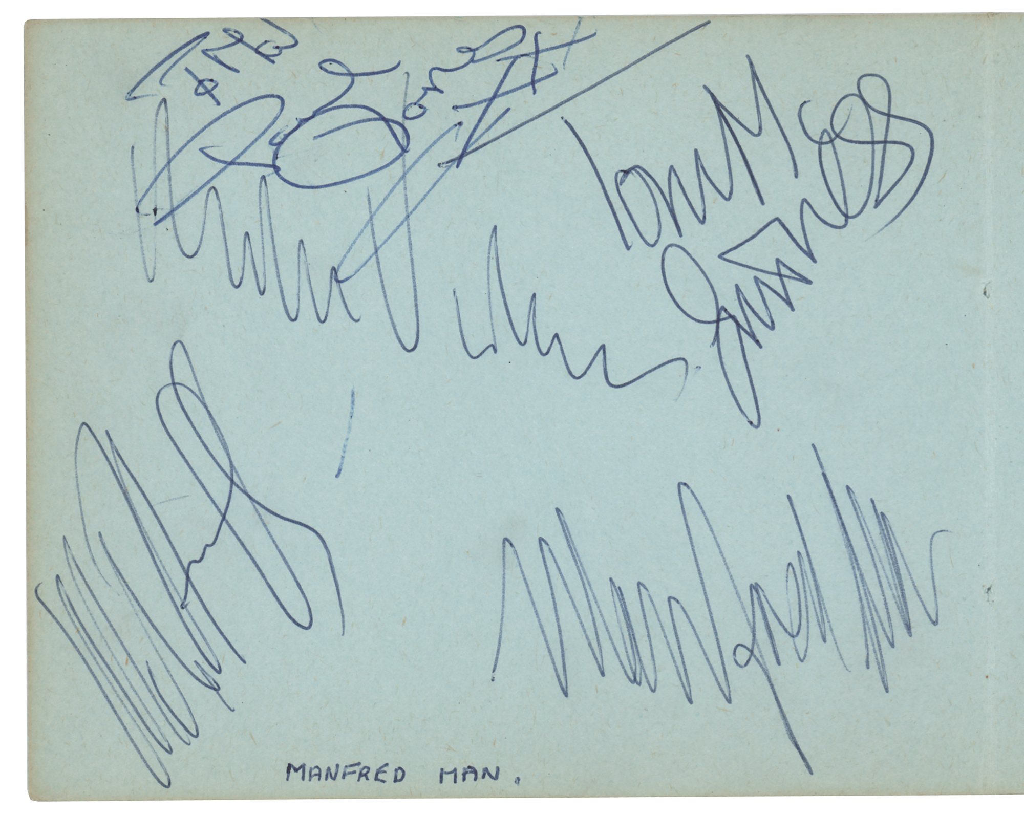 Vintage mid-1960s autographs of the Rolling Stones, including felt tip signatures of Mick Jagger and Brian Jones on a blue 9.75 x 4 album centerfold page; a felt tip signature of Keith Richards on a pink 4.75 x 4 album page; a ballpoint signature and inscription of Charlie Watts on a blue 5 x 4 album page, with Watts adding “The Rolling Stones”; and a ballpoint signature of Bill Wyman on a beige 2.5 x 4 sheet. Also includes a ballpoint signature of the band’s manager and producer, Andrew Loog Oldham, on an off-white 5 x 4 album page. The reverse of the Jagger and Jones page bears signatures of Manfred Mann. In overall fine condition. Accompanied by a certificate of authenticity from Tracks and by a letter of provenance stating that the signatures were “collected by my friend Maralyn McKenzie nee Vogel when she was 15/16 yrs old by waiting at stage door of London venues.”
