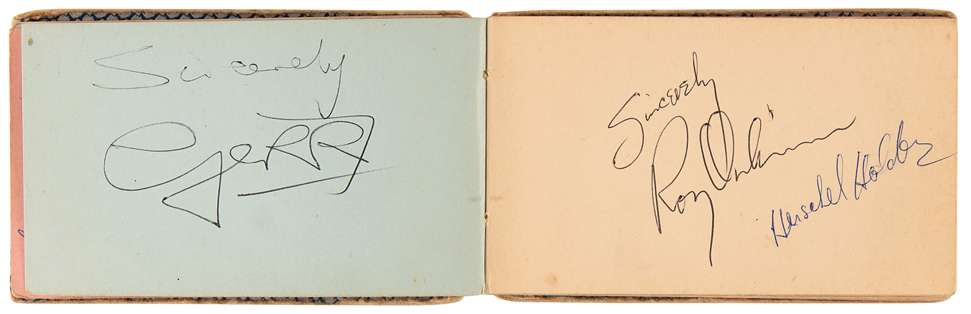 Vintage autograph book, 5 x 3.25, signed inside on the same page by the Beatles — "Paul McCartney, xxx,” “George Harrison,” “John Lennon, xx,” and “Beatles, Ringo Starr, xx.” Starr has signed in blue ballpoint, while his fellow Beatles have signed in black ballpoint. The book also contains the autographs of Roy Orbison and Gerry Marsden, who were also on the bill at the concert. The consignor notes that the autographs were obtained at the Granada Theatre in Tooting, London, England, on June 1, 1963. In fine condition. Accompanied by a certificate of authenticity from Tracks and by a letter from a relative of the original recipient, who attests that the signatures were collected “during the Orbison/Beatles tour of 1963. She was at the concert in Tooting on 1st June 1963 and went with her best friend.”