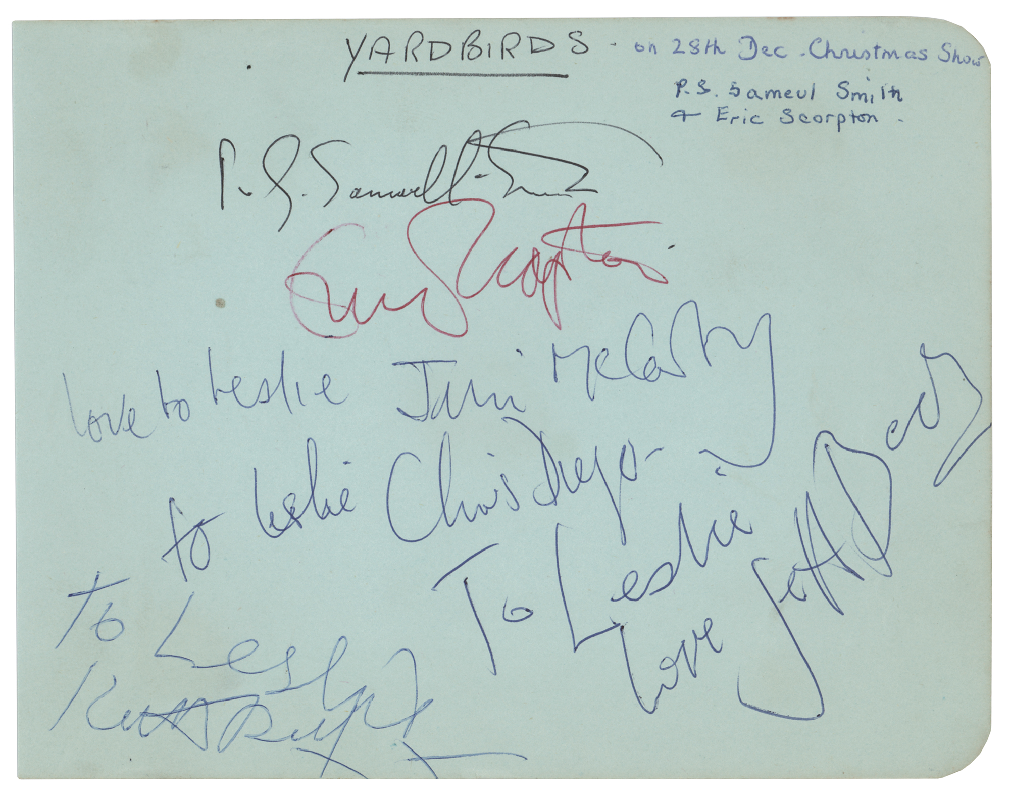 Sought-after vintage ballpoint signatures of The Yardbirds on a light blue 6.25 x 5 album page, which is signed in ballpoint by Eric Clapton, Jeff Beck, Paul Samwell-Smith, Jim McCarty, Chris Dreja, and Keith Relf, with all but Clapton and Samwell-Smith adding inscriptions to a woman named “Leslie.” Collector’s notation indicates that the Clapton and Samwell-Smith signatures were obtained at the Odeon in Hammersmith, London, on December 28, 1964, when the Yardbirds were performing on the Beatles Christmas show; just three months after this, on March 15, 1965, Clapton quit the band and was replaced by Jeff Beck, who played his first gig with the group on March 30, 1965, which is around the time the remainder of the signatures were obtained. In fine condition. Accompanied by a certificate of authenticity from Tracks.