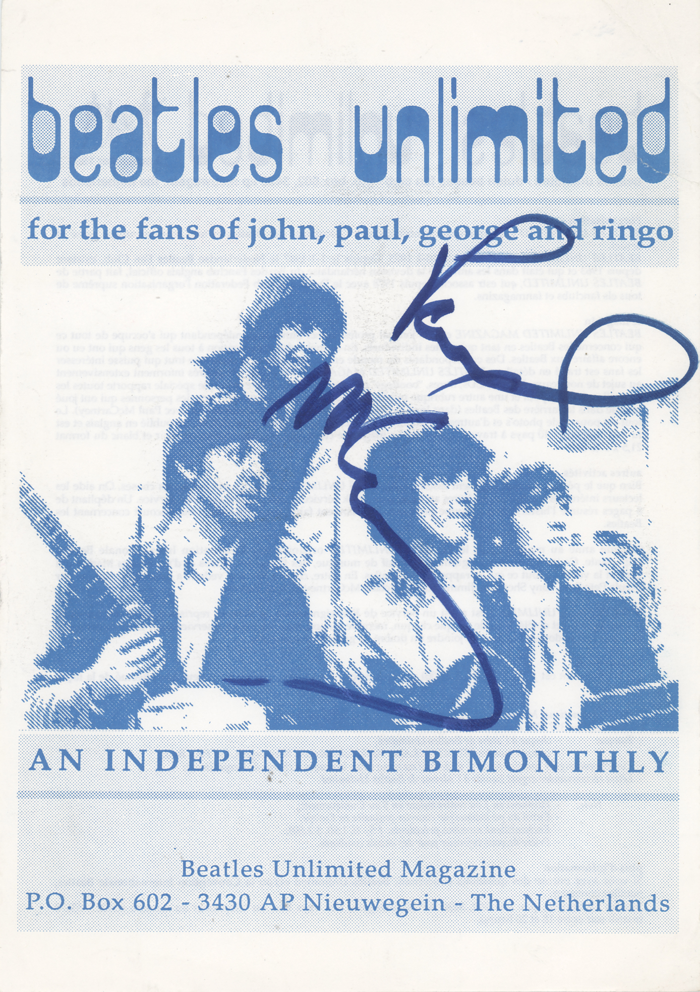 Flyer for the Dutch Beatles fanzine Beatles Unlimited, 5.75 x 8.25, signed prominently on the front in blue felt tip by Paul McCartney. The consignor notes that the signature dates to the late 1980s. In fine condition, with a small unobtrusive tear to the right edge. Accompanied by a certificate of authenticity from Tracks.