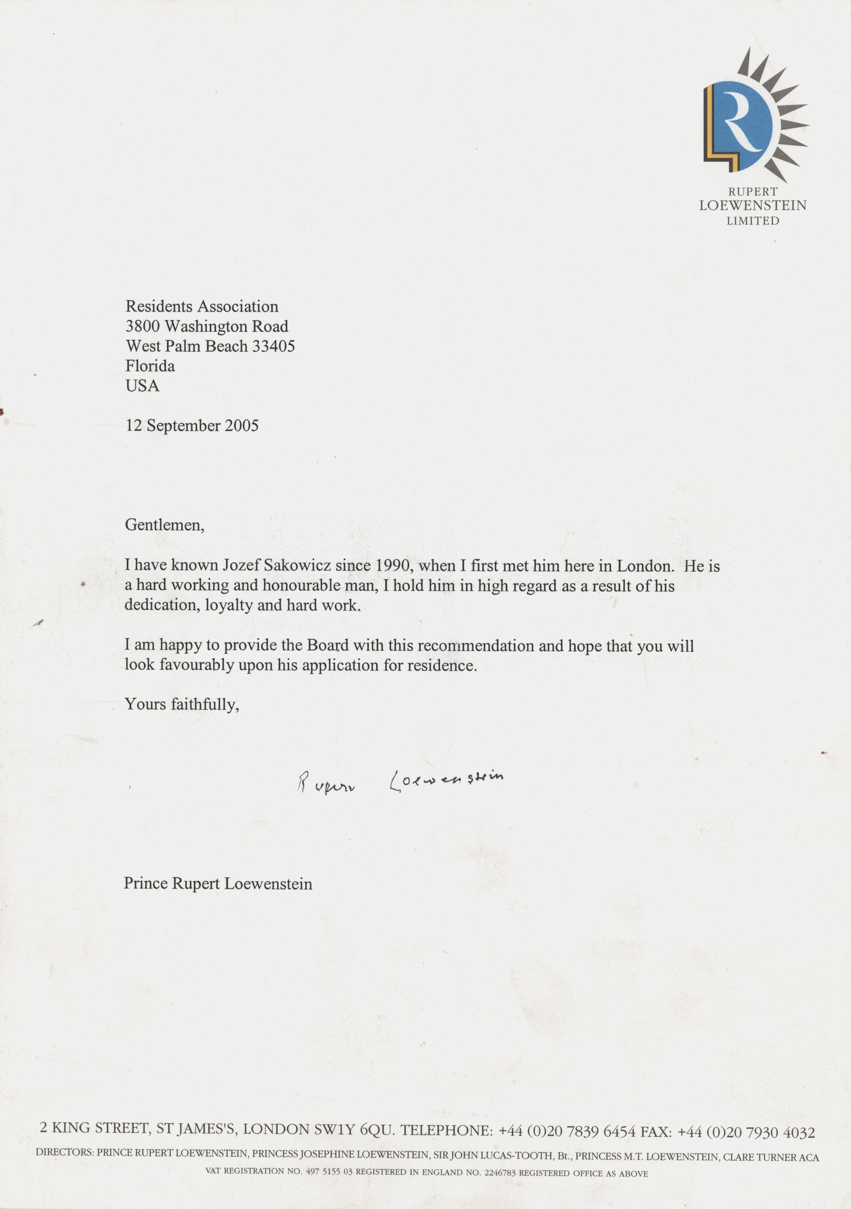 Spanish-born Bavarian aristocrat (1933-2014) who was the longtime financial manager of the rock band the Rolling Stones. TLS, one page, 8.25 x 11.75, personal Rupert Loewenstein Limited letterhead, September 12, 2005. Letter of recommendation sent to the Residents Association, in full: “I have known Jozef Sakowicz since 1990, when I first met him here in London. He is a hard working and honourable man, I hold him in high regard as a result of his dedication, loyalty and hard work. I am happy to provide the Board with this recommendation and hope that you will look favourably upon his application for residence.” In very good to fine condition, with scattered creasing, and a fold across the bottom. Accompanied by a certificate of authenticity from Tracks.