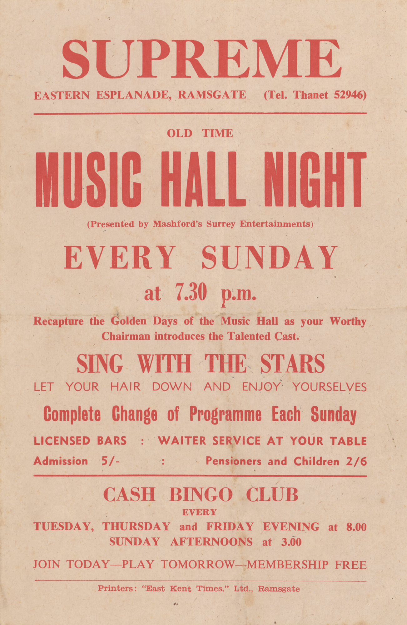 Vintage handbill from the Supreme Ballroom in Ramsgate, England, 4.75 x 7.5, signed on the reverse in ballpoint by Cream members Eric Clapton, Jack Bruce, and Ginger Baker. The consignor notes that the signatures were obtained when the band performed at the venue on July 15, 1967. In very good to fine condition, with light handling wear, intersecting folds, and somewhat irregular toning. Accompanied by a certificate of authenticity from Tracks and by a letter of provenance from the original recipient: “These signatures of Eric Clapton, Ginger Baker and Jack Bruce were obtained in 1967. Cream performed in Ramsgate, Kent. All 3 members signed this flyer for me after the gig.”
