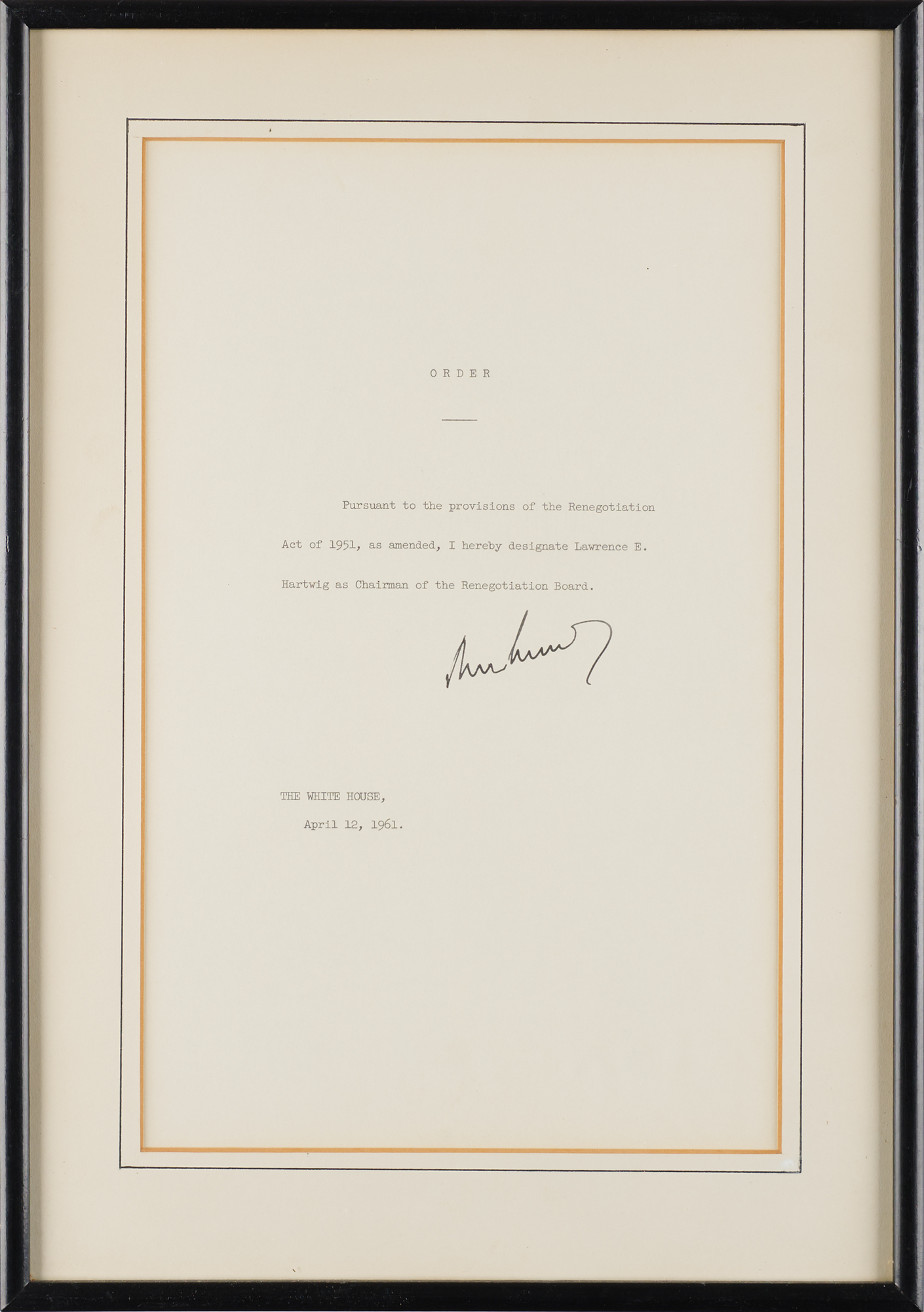 DS as president, one page, 8 x 13, April 12, 1961. An official order issued from the White House by President Kennedy, in full: "Pursuant to the provisions of the Renegotiation Act of 1951, as amended, I hereby designate Lawrence E. Hartwig as Chairman of the Renegotiation Board." Boldly signed at the conclusion in ink by President John F. Kennedy. Matted and framed to an overall size of 11.5 x 16.55. In fine condition. The Federal Renegotiation Board was established in 1951 to review and renegotiate defense contracts to prevent excessive profits by private enterprise.