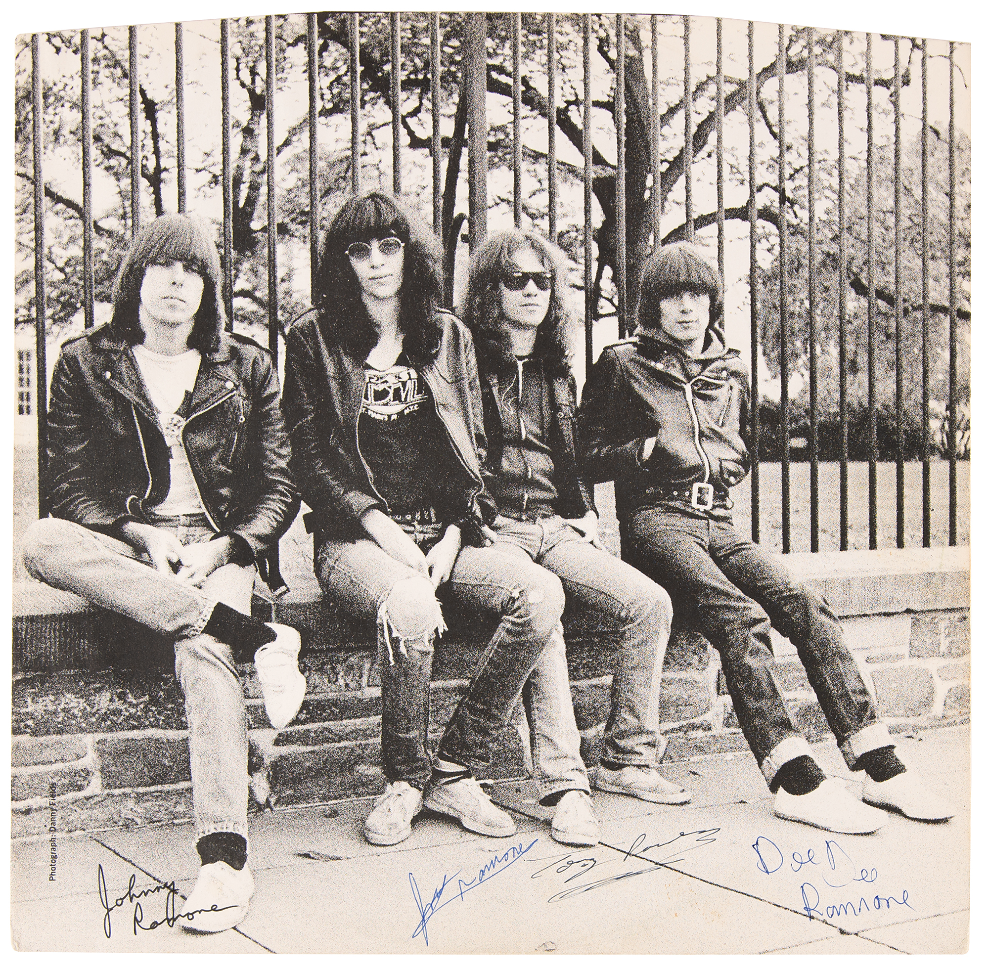 Leave Home album signed on the inner sleeve in blue and black ink by Johnny Ramone, Joey Ramone, Tommy Ramone, and Dee Dee Ramone. In fine condition, with edgewear to the album's spine. The record is included.