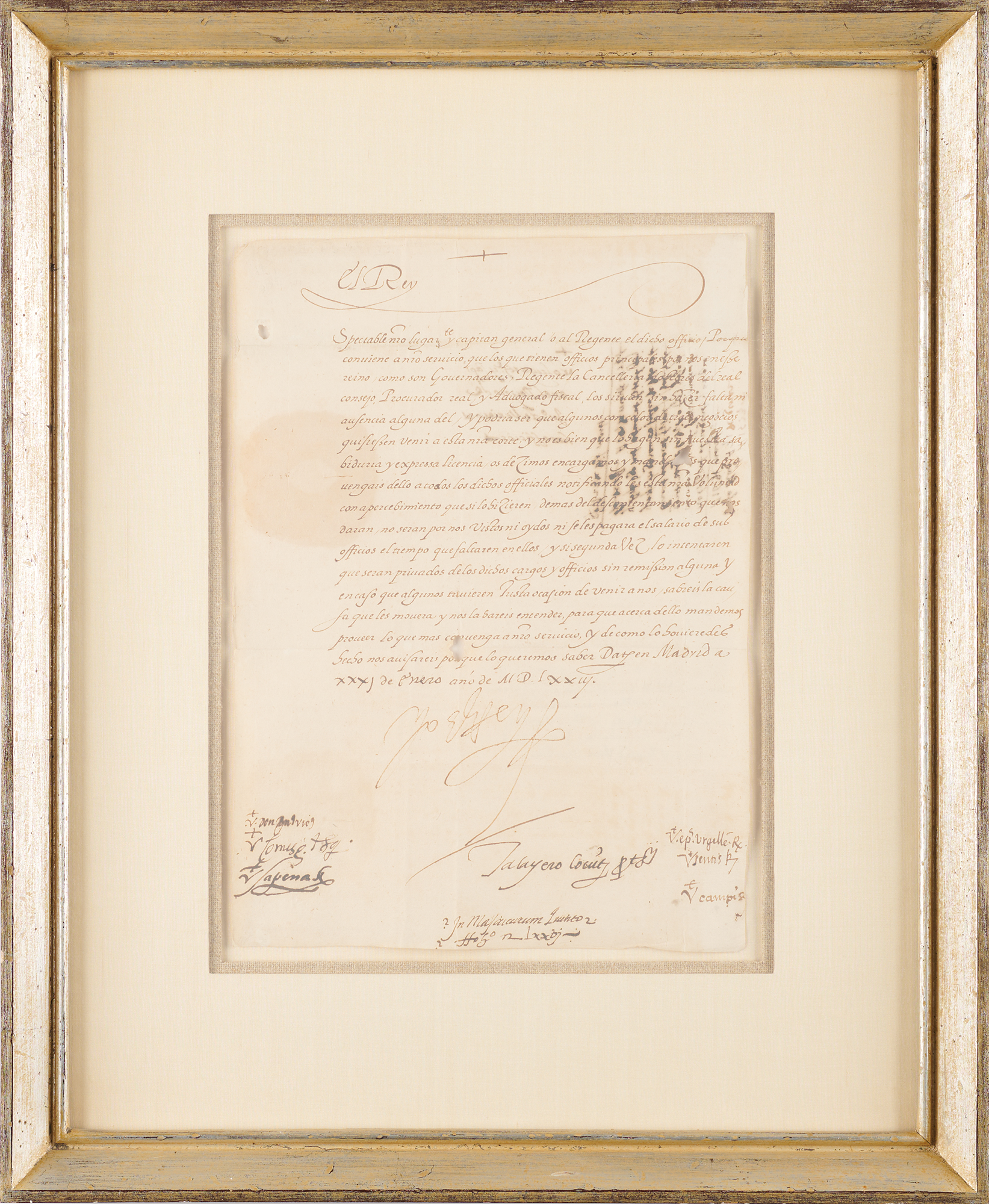 King of Spain (born 1527) from 1556 until his death in 1598; Sovereign of the Spanish Empire over North and South America, King of Portugal, Naples, Spanish Holland and Sicily, and King of England and Ireland while married to Queen Mary I. Manuscript DS in Spanish, signed “Yo El Rey,” one page, 8.5 x 11.5, January 31, 1574. Untranslated administrative order, prominently signed at the conclusion in ink by King Philip II. Mounted, double-matted, and framed to an overall size of 16 x 19.5. In fine condition, with a few small holes, affecting a couple of words of text.