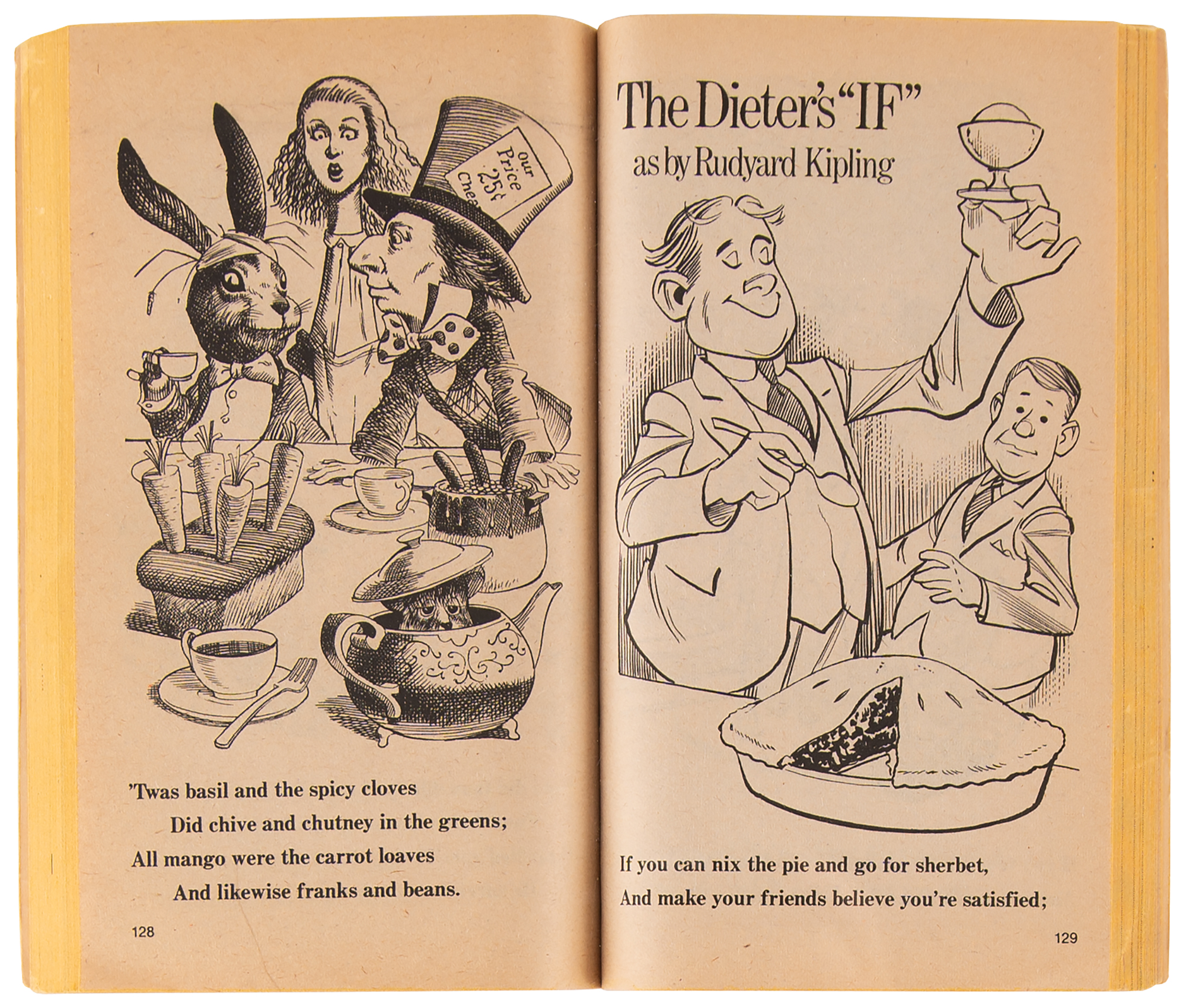 Versatile American illustrator (1926-2013) whose work appeared in advertisements and MAD Magazine. The label of the Cutty Sark bottle is his creation. Original artwork by MAD Magazine illustrator Bob Clarke for the 1981 paperback book, Get Stuffed with MAD by Frank Jacobs and Bob Clarke, comprised of his original artwork for the seven-panel comic strip, “The Dieter’s ‘IF,’ as by Rudyard Kipling,” the fourth comic of the chapter, “If Great Poets Wrote About Food.” The comic strip is accomplished in colored pencil, ink, and felt tip on four panels ranging in size from 7 x 11 to 14 x 11, with the pages accordingly numbered as they appear in the book, a copy of which is included. The comic strip depicts a very disciplined man on a diet who, after resisting six tasty food items, is revealed to be a wind-up machine pictured next to the Star Wars character R2-D2. Affixed caption text to the last panel reads: “If you’ve the will for sticking with this diet, And somehow all these yummy things avoid, Don’t tell me that you’re a human – I won’t buy it; ‘Cause, man, you gotta be some kind of droid.” In fine condition.