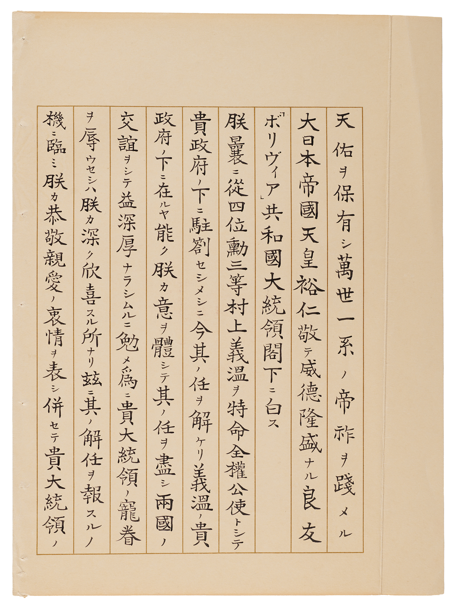 Emperor of Japan (born 1901) from 1926 to his death in 1989. Hirohito's reign was marked by rapid militarization and aggressive wars against China and the United States. Following the devastating result of the atomic bombs dropped on Nagasaki and Hiroshima in World War II, he renounced his divinity in favor of a democratic constitutional monarchy. LS in Japanese, boldly signed in black ink by Emperor Hirohito, two pages on two adjoining sheets, 9.25 x 12.5, May 16, 1938. Official letter of state to "His Excellency the President of the Republic of Bolivia," in part (translated): "We have deemed it fitting to recall Yoshiatsu Murakami…decorated with the Third Class of Our Imperial Order of the Sacred Treasure, whom We had accredited to the Government of the Republic of Bolivia in the capacity of Our Envoy Extraordinary and Minister Plenipotentiary. In informing You of this decision, We take pleasure in noting that, during the time he resided with You, he devoted all his efforts—guided always by Our intentions—to the fulfillment of his mission and to the development of the friendly relations that so happily exist between Our two Countries, and that he was thereby able to merit Your high benevolence. We seize this opportunity to express to You Our sentiments of high esteem and sincere affection, while conveying to You, at the same time, the fervent wishes We form for Your happiness and prosperity." In fine condition. Accompanied by its official typed French translation.