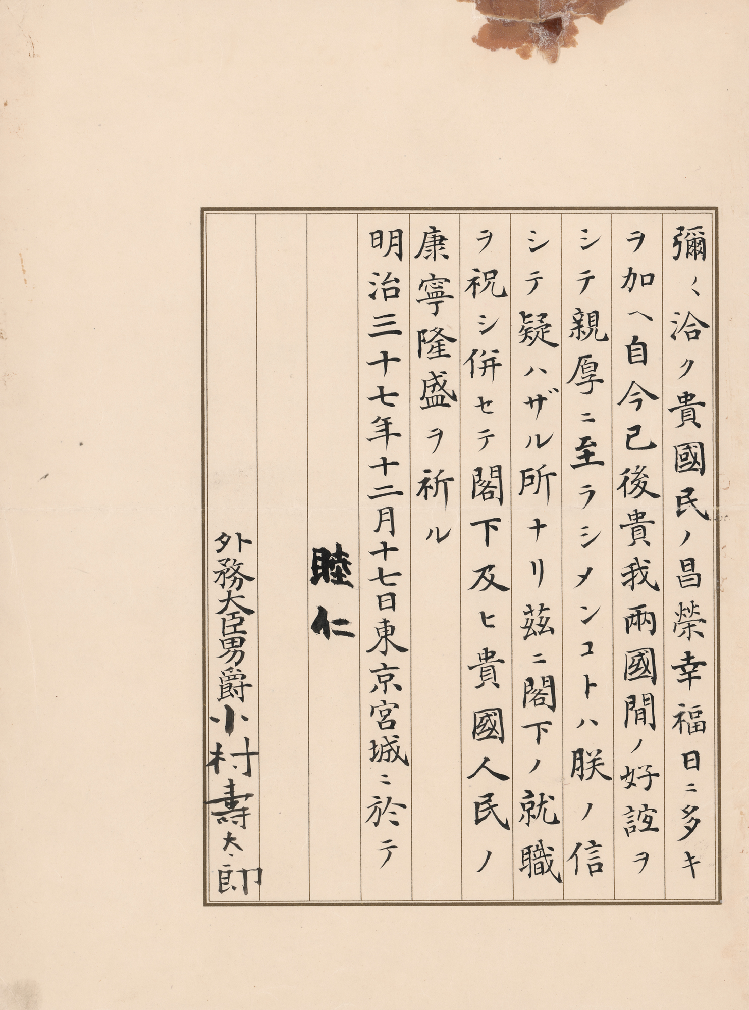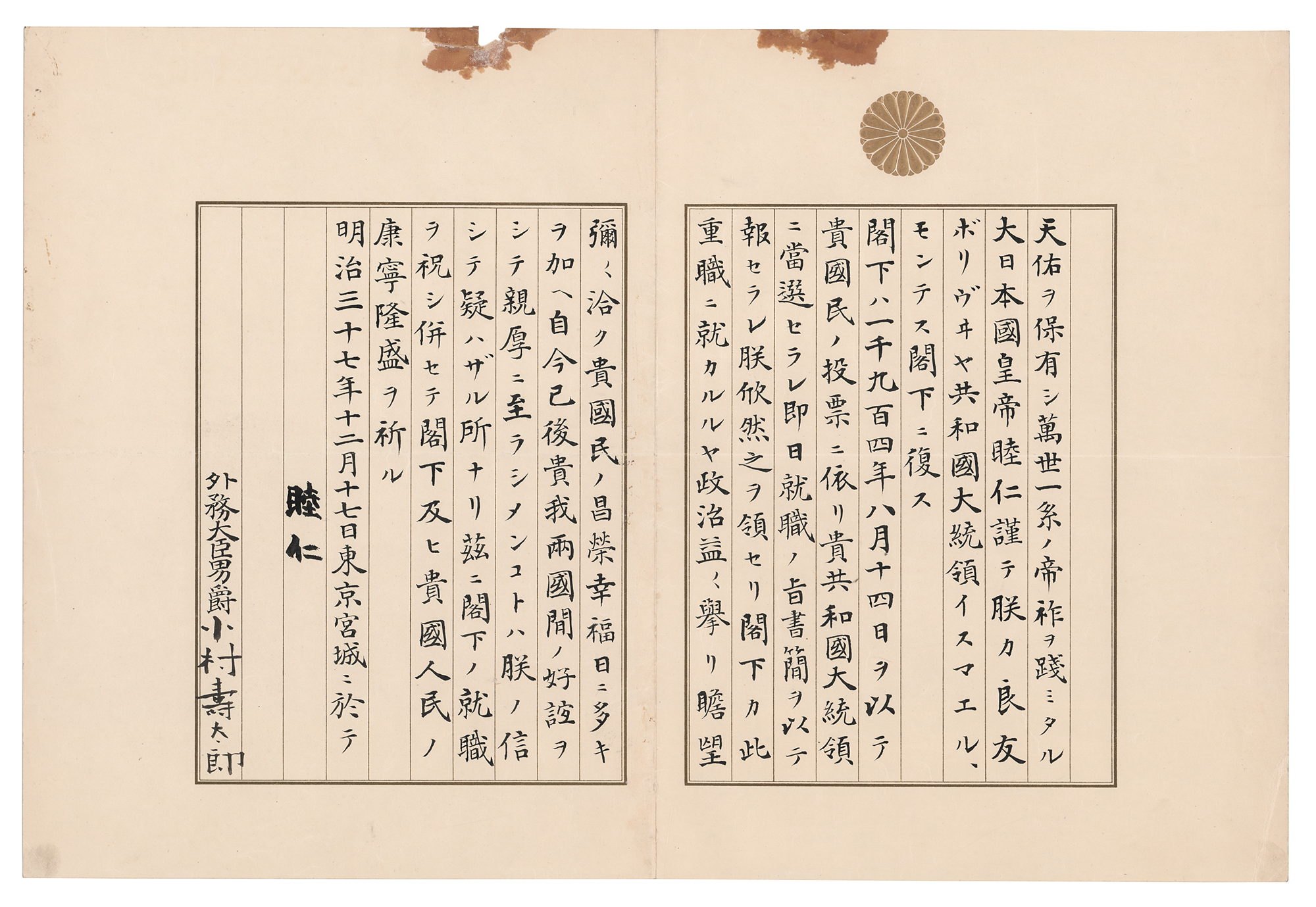 Emperor Meiji Letter Signed to the President of Bolivia, Congratulating Him on His Election