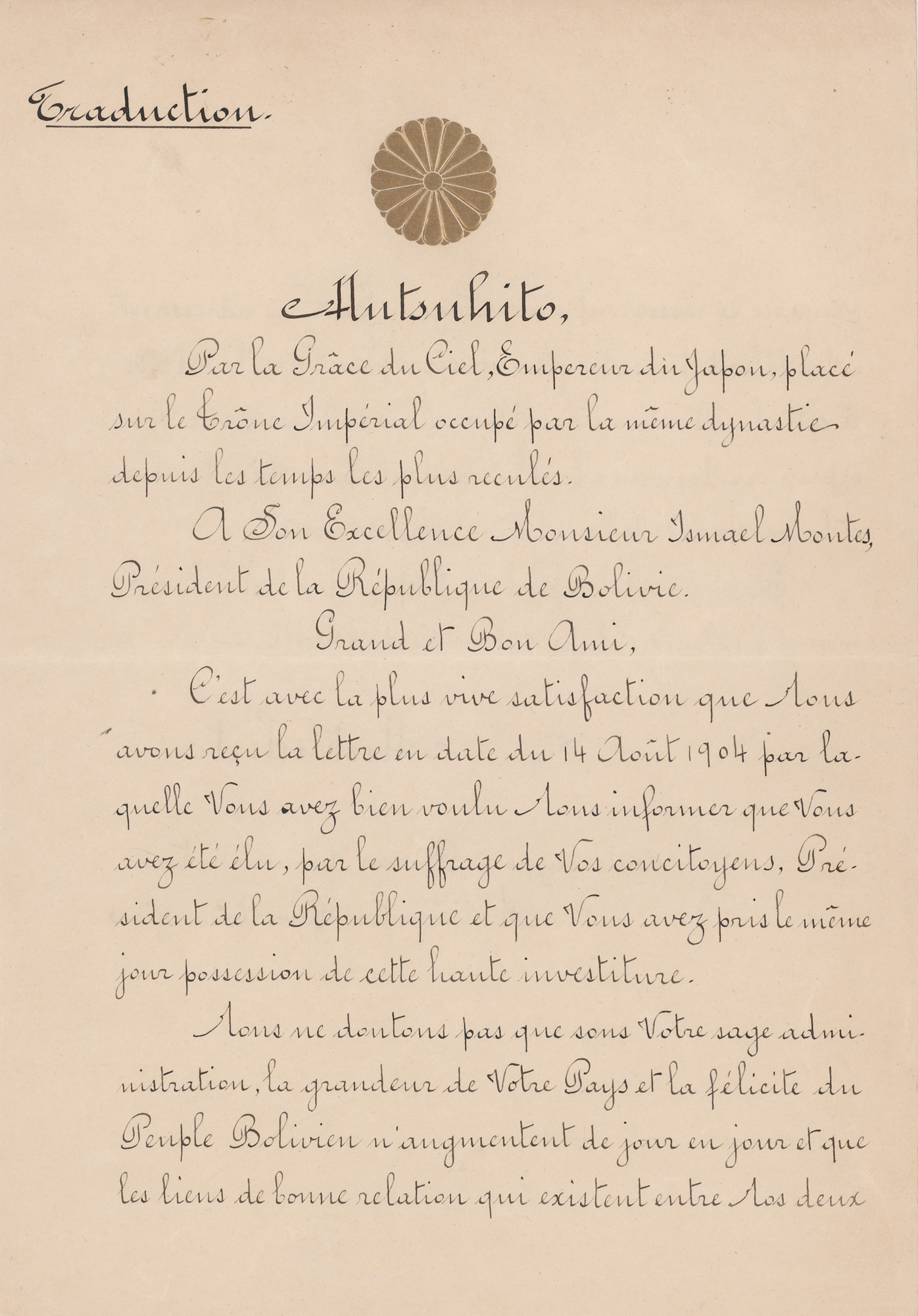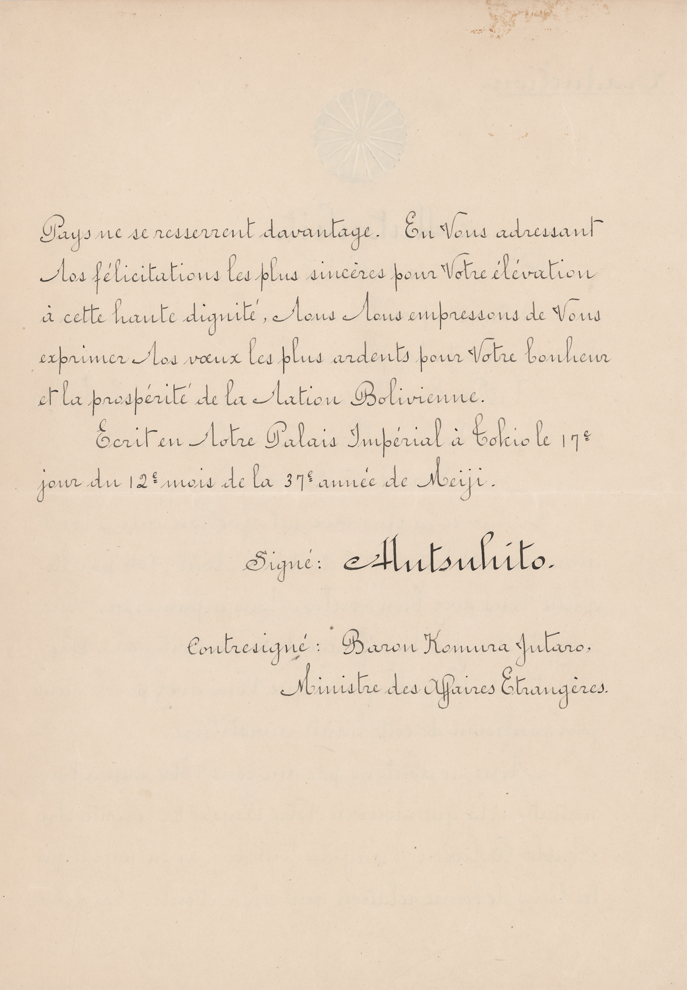 LS in Japanese, boldly signed in black ink by Emperor Meiji, two pages on two adjoining sheets, 9 x 12, December 17, 1904. Official letter of state to "His Excellence Mr. Ismael Montes, President of the Republic of Bolivia," in part (translated): "It is with the most lively satisfaction that We have received the letter dated August 14, 1904, by which You have been so kind as to inform Us that You have been elected, by the suffrage of Your fellow citizens, President of the Republic and that You have on the same day taken possession of this high investiture. We do not doubt that under Your wise administration, the grandeur of Your Country and the happiness of the Bolivian People will increase day by day…In extending to You our most sincere congratulations for Your elevation to this high dignity, We hasten to express to You Our most ardent wishes for Your happiness and the prosperity of the Bolivian Nation." In very good to fine condition, with stains and related paper loss at the top edge. Accompanied by its official manuscript French translation.