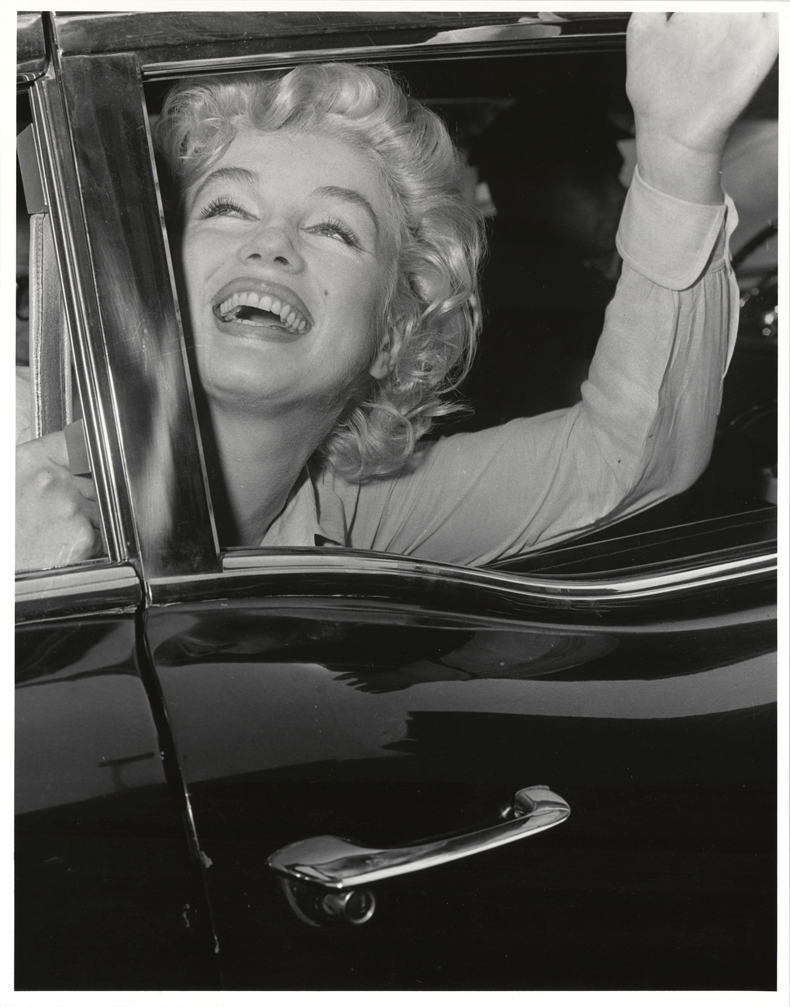 Original vintage circa 1959 semi-glossy 11 x 14 silver gelatin photograph of Marilyn Monroe waving from an automobile as she leaves Lennox Hill Hospital on June 26, 1959, as captured by Brooklyn Dodgers photographer Barney Stein. Reverse bears Stein's credit stamp. In fine condition. Accompanied by a full letter of authenticity from PSA/DNA, certifying it as an authentic "Type I" photograph from circa 1959.
