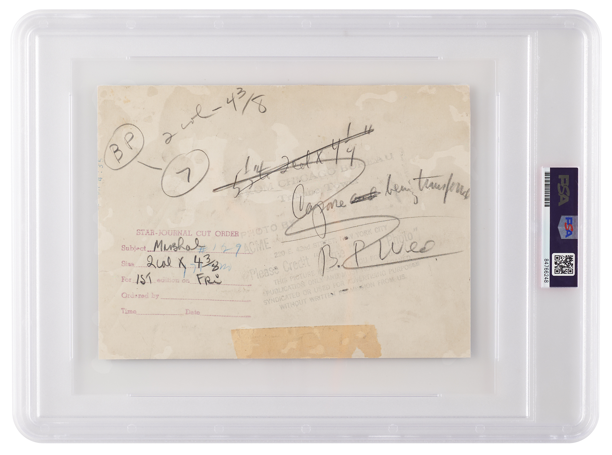 Original glossy 8.25 x 6.25 silver gelatin news service photograph of Al Capone smiling and seated next to U.S. Marshal H. C. W. Laubenheimer on a train car bound for Atlanta, Georgia, and the United States Penitentiary in May 1932. The reverse of the photo bears pencil notations, a “Star-Journal Cut Order” stamp, and an Acme photo credit stamp from “Chicago Bureau, Tribune Tower.” In very good condition, with trimmed edges, overall creasing, and surface impressions from notations on the back. Encapsulated by PSA as an authentic 'Type I' photograph from 1932.