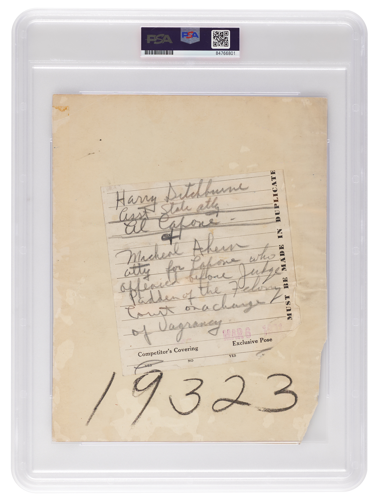 Original vintage pearl-finish 9.5 x 7.5 photograph of Al Capone at Chicago’s Superior Courthouse in early March 1931, when he was brought in on charges of vagrancy. The reverse bears an affixed caption, annotated and date-stamped March 6, 1931. In very good condition, with rippling, creasing, and loss to the bottom edge. Encapsulated by PSA as an authentic 'Type I' photograph from circa 1931.