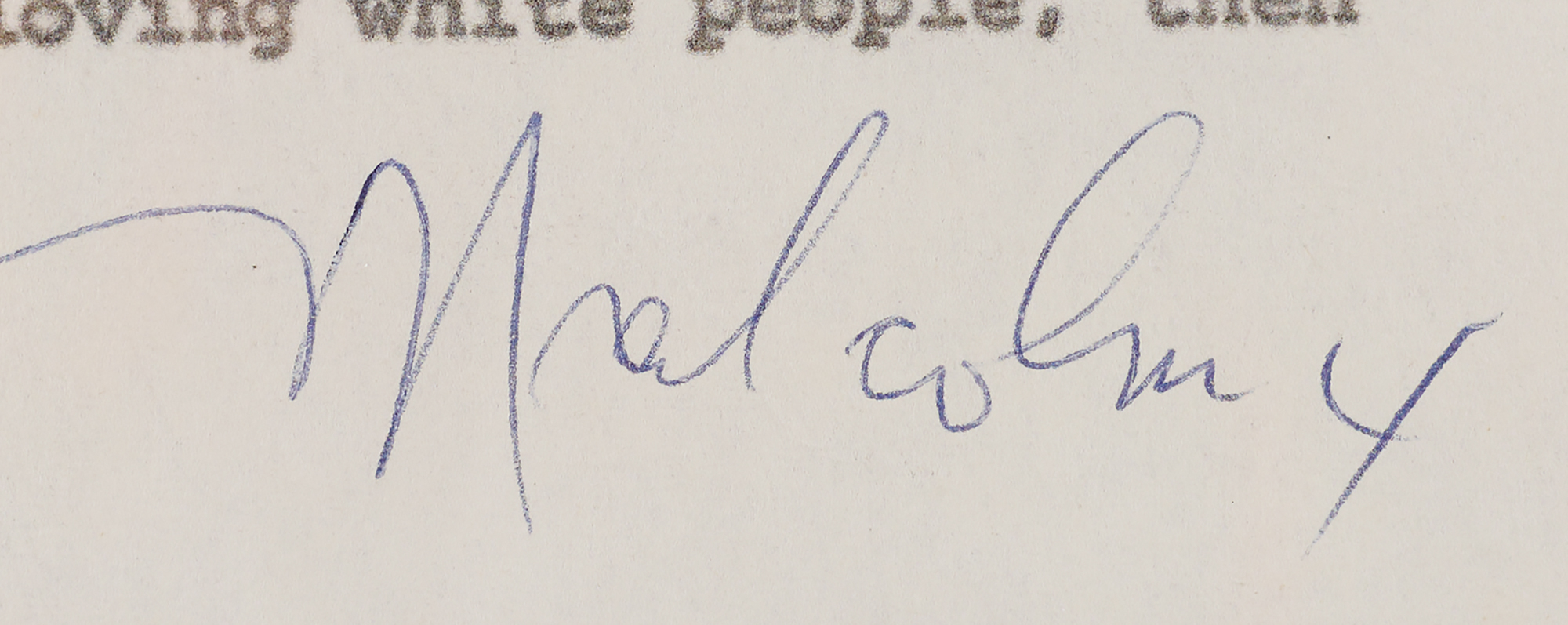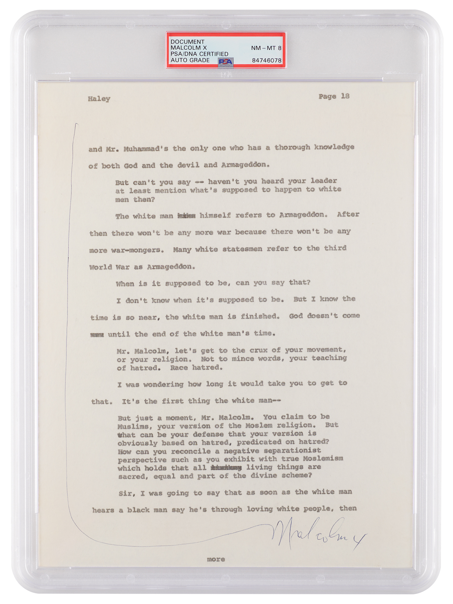 Page 18 from the original typescript of Alex Haley’s 1963 interview of Malcolm X for Playboy magazine, one page, 8.5 x 11, signed "Malcolm X" in the bottom margin (with a marginal line indicating his approval of the contents). In full: [Malcolm X] and Mr. Muhammad's the only one who has a thorough knowledge of both God and the devil and Armageddon.