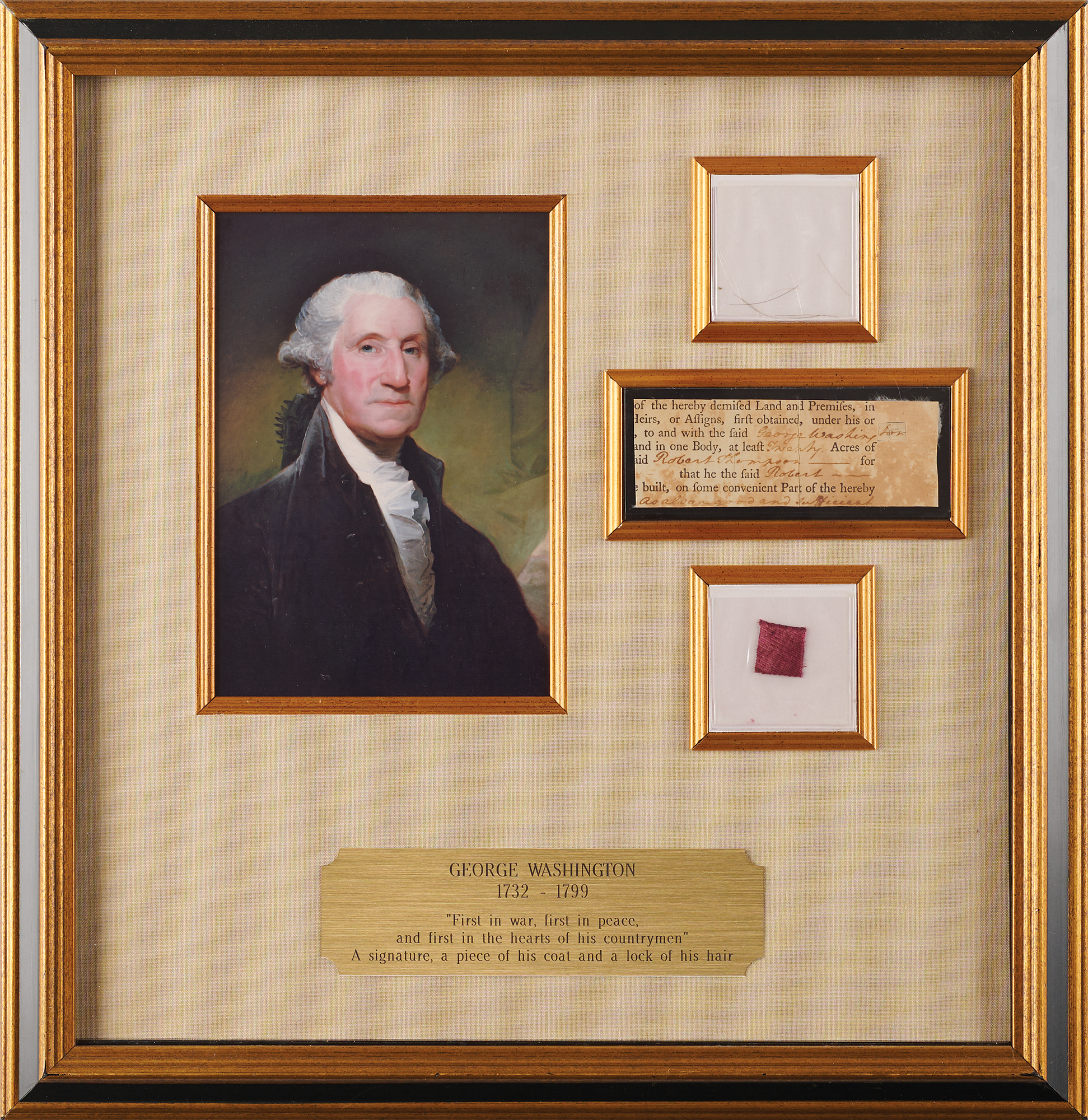 Fantastic display consisting of a scarce full ink signature, "George Washington," on an off-white 4 x 1.5 slip clipped from a larger land indenture between Washington and Robert Thompson for the lease of 150 acres in Virginia, dated March 17, 1769. Also included is a .75 x .75 swatch of Washington's cloak from the family of Colonel Tobias Lear, Washington's personal secretary and good friend; and six strands of Washington's hair from the Custis-Powell family. All three items are nicely cloth matted and framed, with a color portrait of Washington and a descriptive plaque, to an overall size of 14.75 x 15.25. In very good condition, with mottled staining to the slip, and the end of the signature ("ton") clipped and added from another part of the document. Accompanied by a provenance packet documenting the origins of all three pieces, and a full letter of authenticity from PSA/DNA for Washington's autograph.